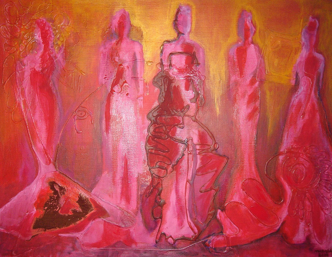 Verbondenheid vrouwen". Geschilderd in acrylverf en gemengde technieken op linnen doek 70x90 cm. In rood/roze tinten, met koperfolie en duidelijk zichtbaar reliëf.