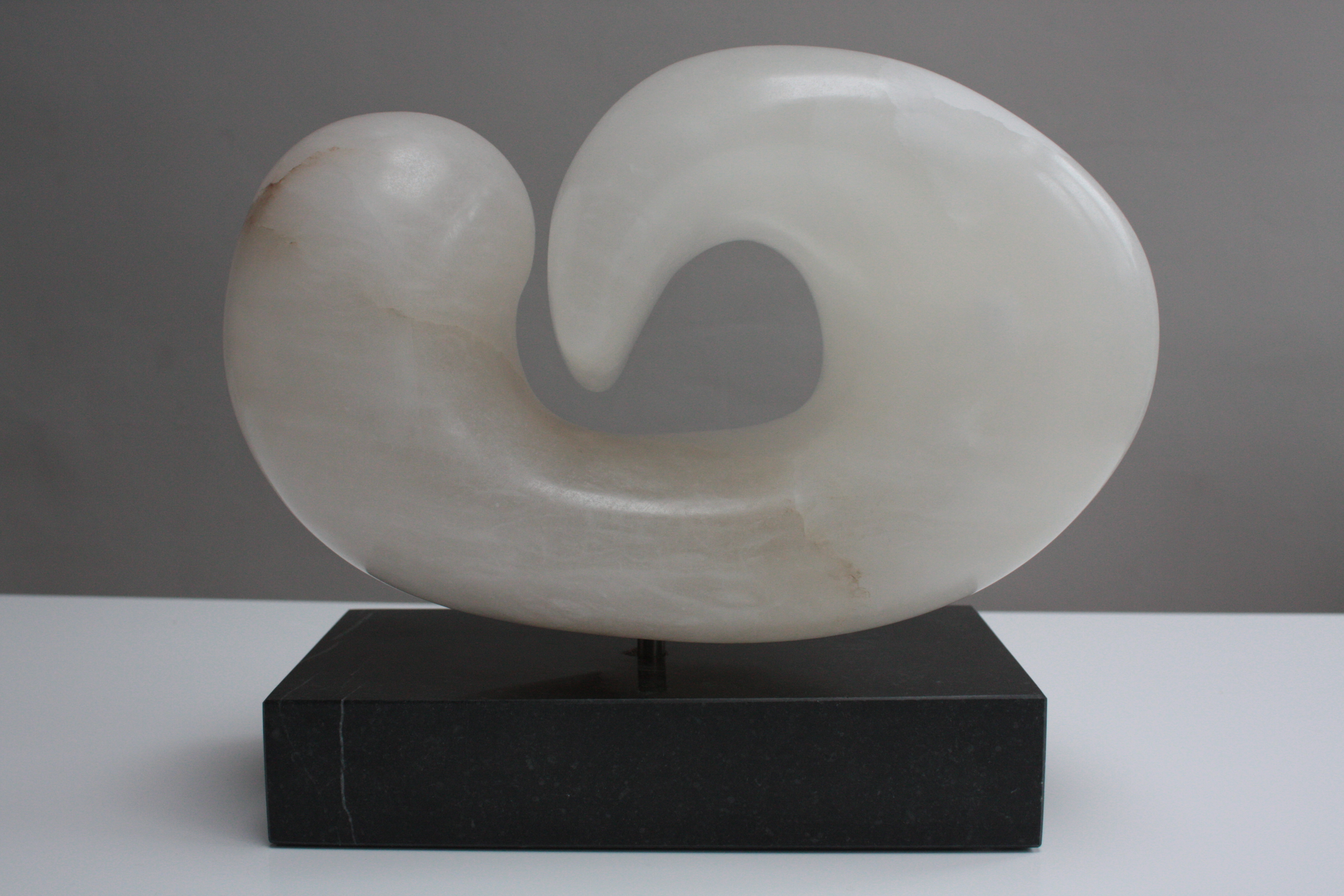 In Spaans wit albast uitgevoerde lus op hardstenen sokkel. Bij aanraking met de steen wordt een mooie heldere gong waargenomen. Dit beeld is per vrijdagavond 2 september 2011 gestolen uit mijn tijdelijk atelier bij Open | Makers aan de Markt, Aalmarkt 15b, Leiden. Meer info: info@simonevanolst.nl