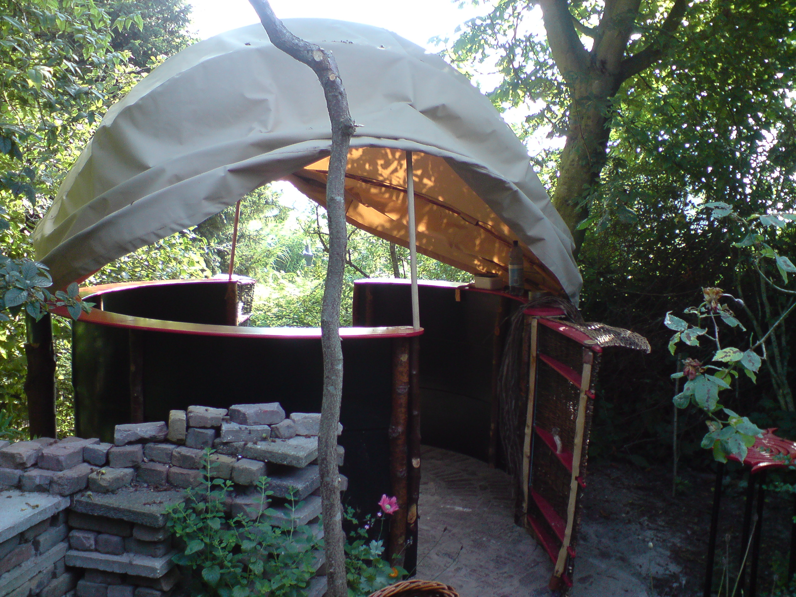 meditatie plek voor 1 tot 9 personen. overdekt. heel of half open kan ook. banken van wilgentenen. deurtjes van wilgentenen.