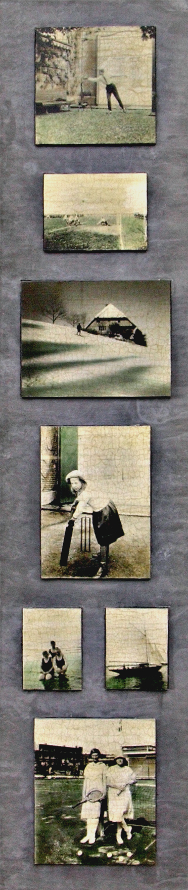 Het thema is sport, tussen twee wereldoorlogen. De foto's zijn op loden panelen bevestigd.
