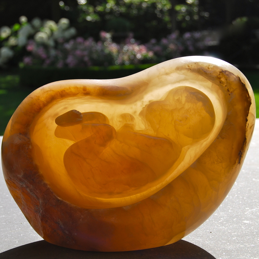 'Naissance', zo fijn, zo teder, zo levend en expressief zal zij eeuwig blijven... Het albast en de verschillende honingkleurige tinten en aderen spelen met het licht. "Naissance' laat het leven zien onder de huid van de foetus. De afwerking van het beeld is zeer verfijnd en de zachte glooiingen maken het teder en lichamelijk. De baby straalt licht en nodigt uit om aangeraakt te worden. Spaanse honingalbast, gepolijst, unicum.