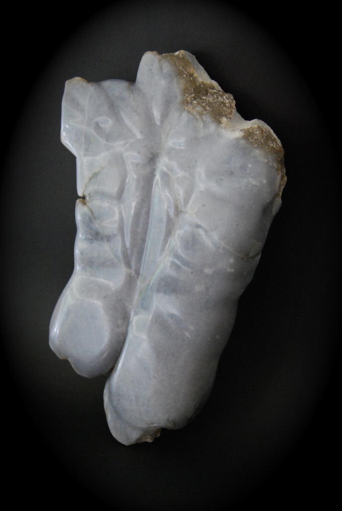 “Een vorm geeft ziel aan de materie.” Voor 'Puissance' maakte ik gebruik van de spanning in de aanwezige lijnen en vormen van de aderen en kleiresten in de steen. Wandsculptuur, blauwe albast, gepolijst, unicum.