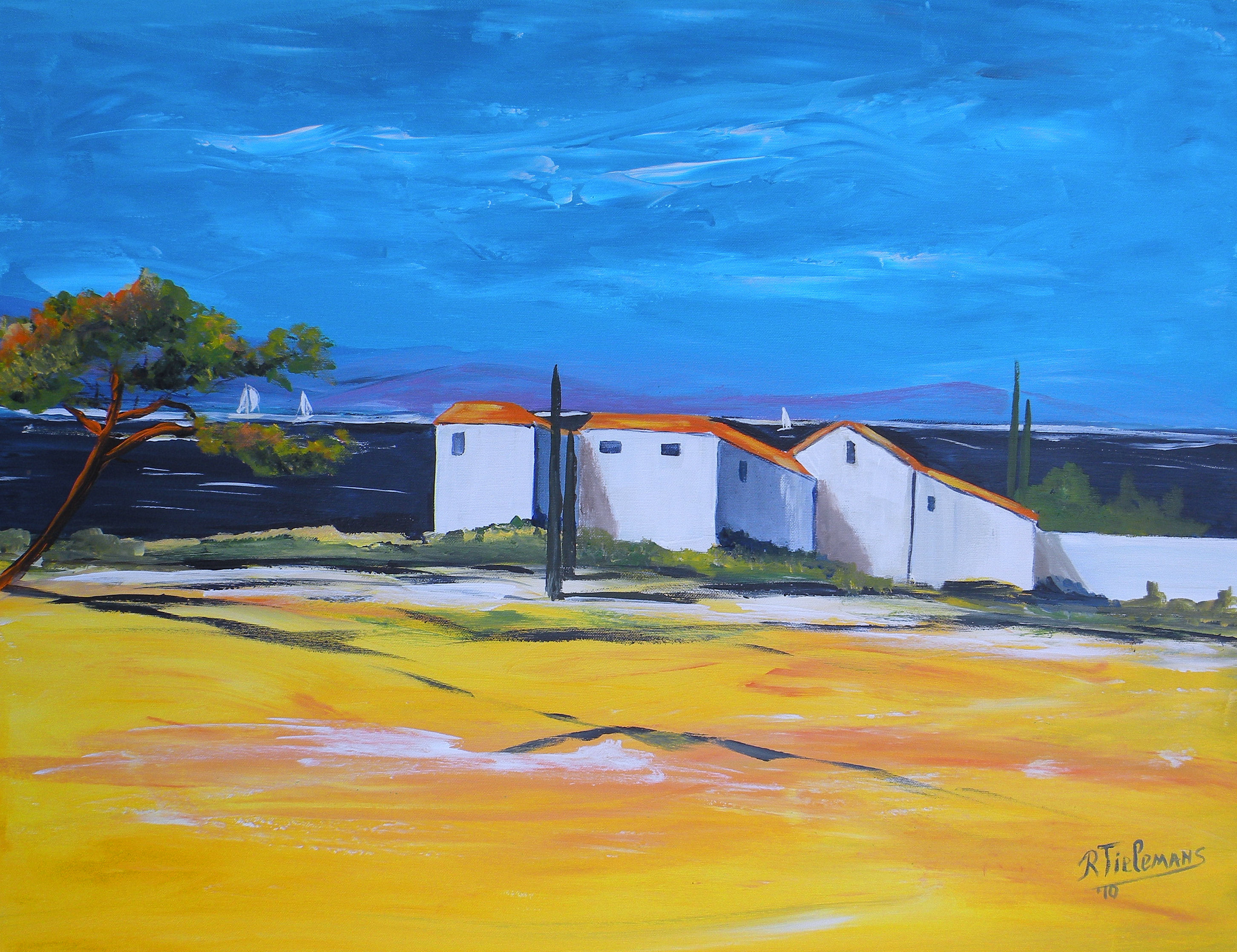 Zee Rood Geel Blauw Acryl Yellow Groen Blue Bomen Red Green Acrylic Lucht Air Boerderij Farm Sea Trees
