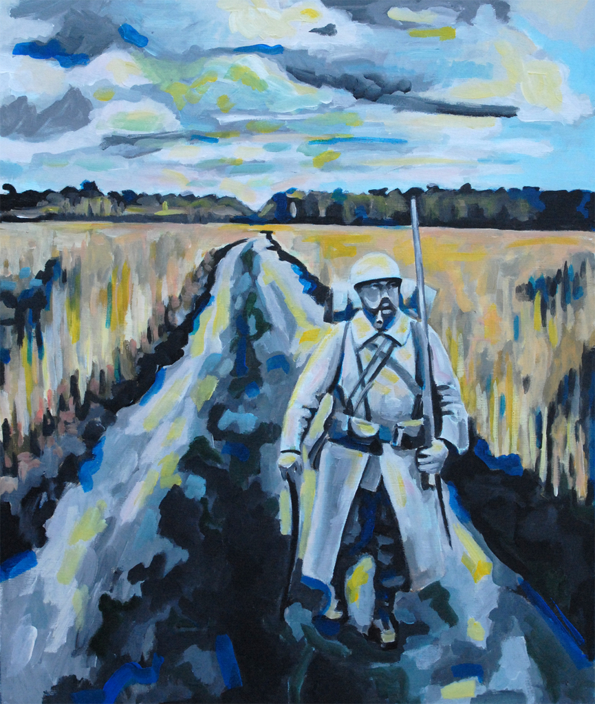 Portret van een soldaat uit de eerste wereldoorlog. Dit schilderij is gebaseerd op foto's van een Frans soldaat die tijdens de eerste wereldoorlog leefde. Ik heb de achtergrond gebaseerd op schetsen die ik in de cirkel te Reusel maakte. Er zijn heel wat soldaten gestorven in de loopgraven toen. Maar ook een heel aantal toen de oorlog eindelijk al ten einde was, door sluipschutters terwijl ze al op weg naar huis waren.