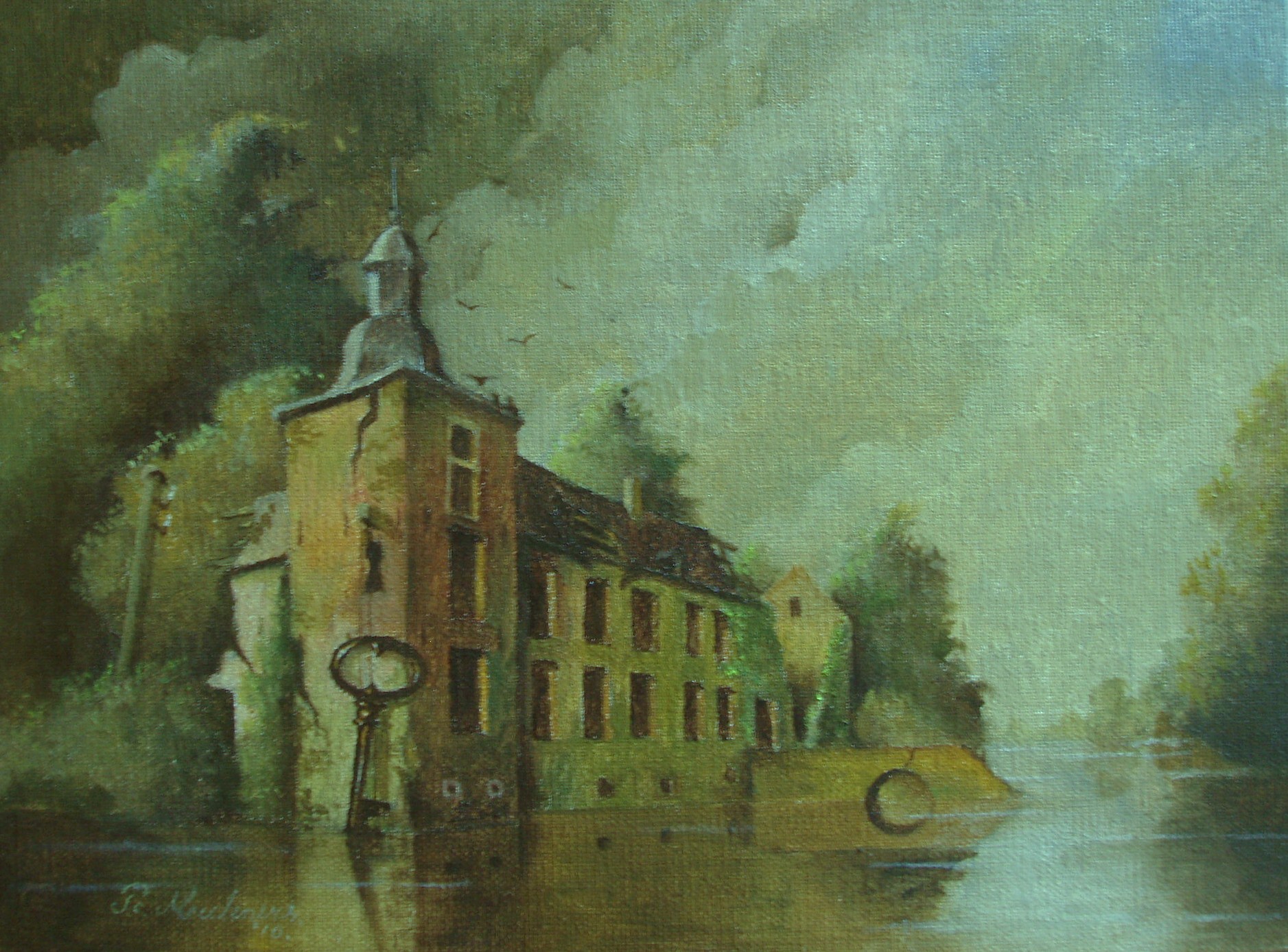 Landschap Romantiek Water Canvas Olieverf Lucht On Realisme Fantasie Vogels Kasteel Sleutel Board