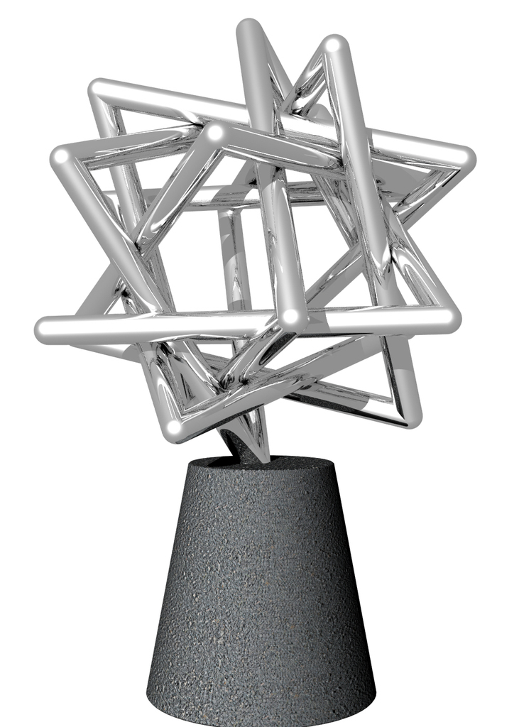Deze regelmatige dodecaëd\er ster is een van de ruimtelijke weergaven van het regelmatige 12 vlak. RVS op een granieten basis