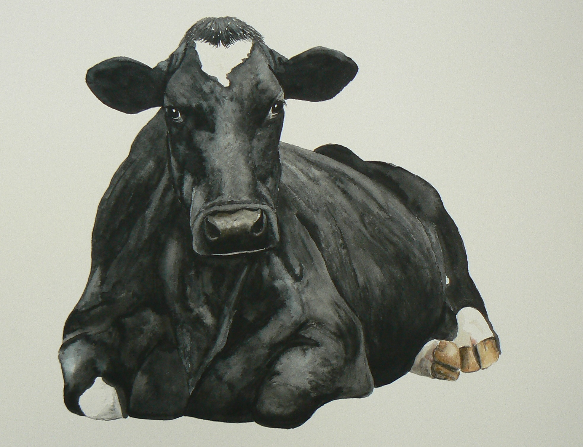 Portret van een volwassen koe. Zelfbewust, nieuwsgierig en niet bang, lag ze in een weiland bij de Lek. De vacht glanst zacht in de zon.