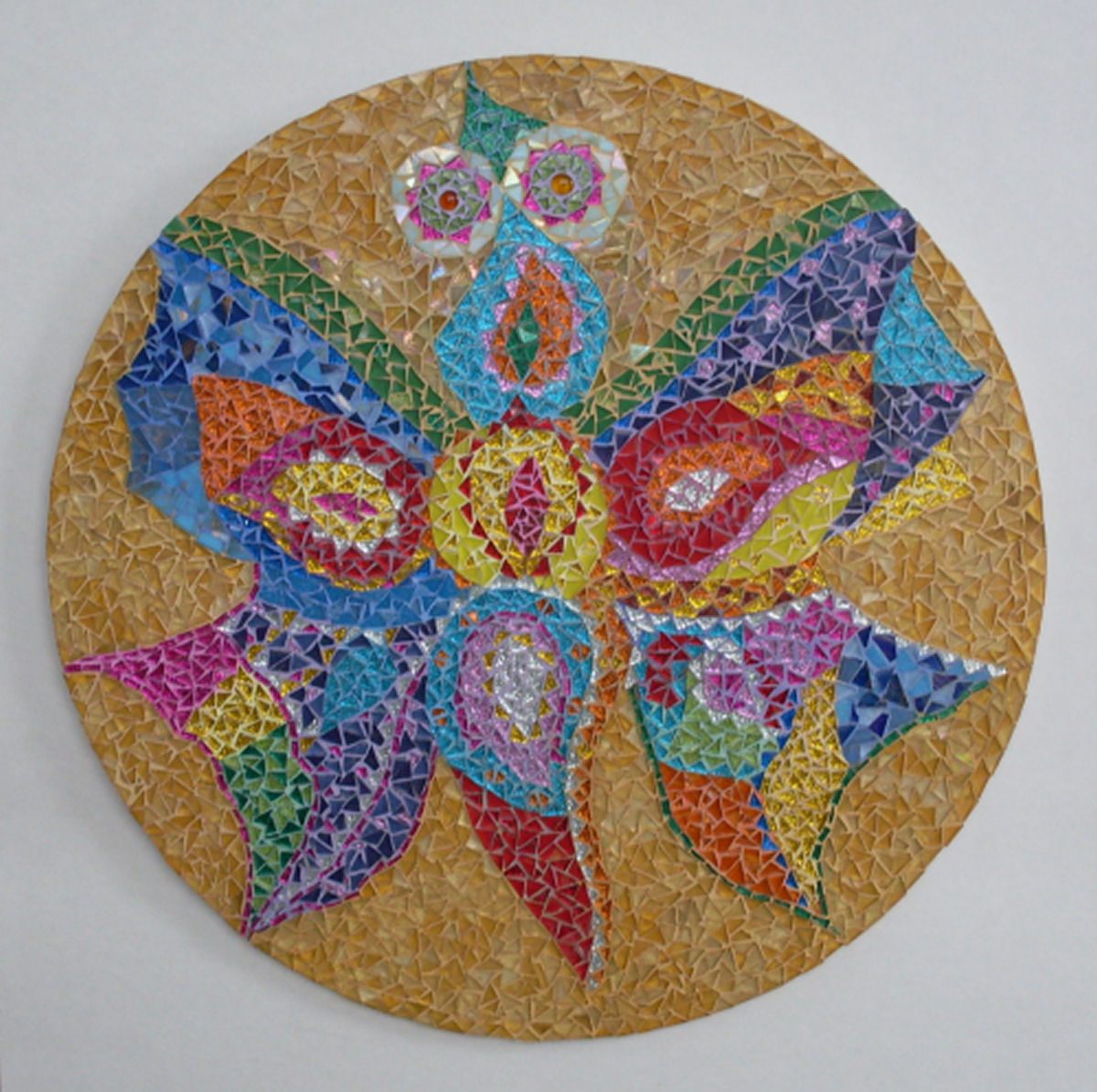 Nelleke Robbe vervaardigd objecten in glasmozaiek voor binnen (op basis van MDF) en buiten (op basis van volkern kunststof, TRESPA) Deze worden gevoegd met voegcement waaraan kleurpigmenten zijn toegevoegd.
