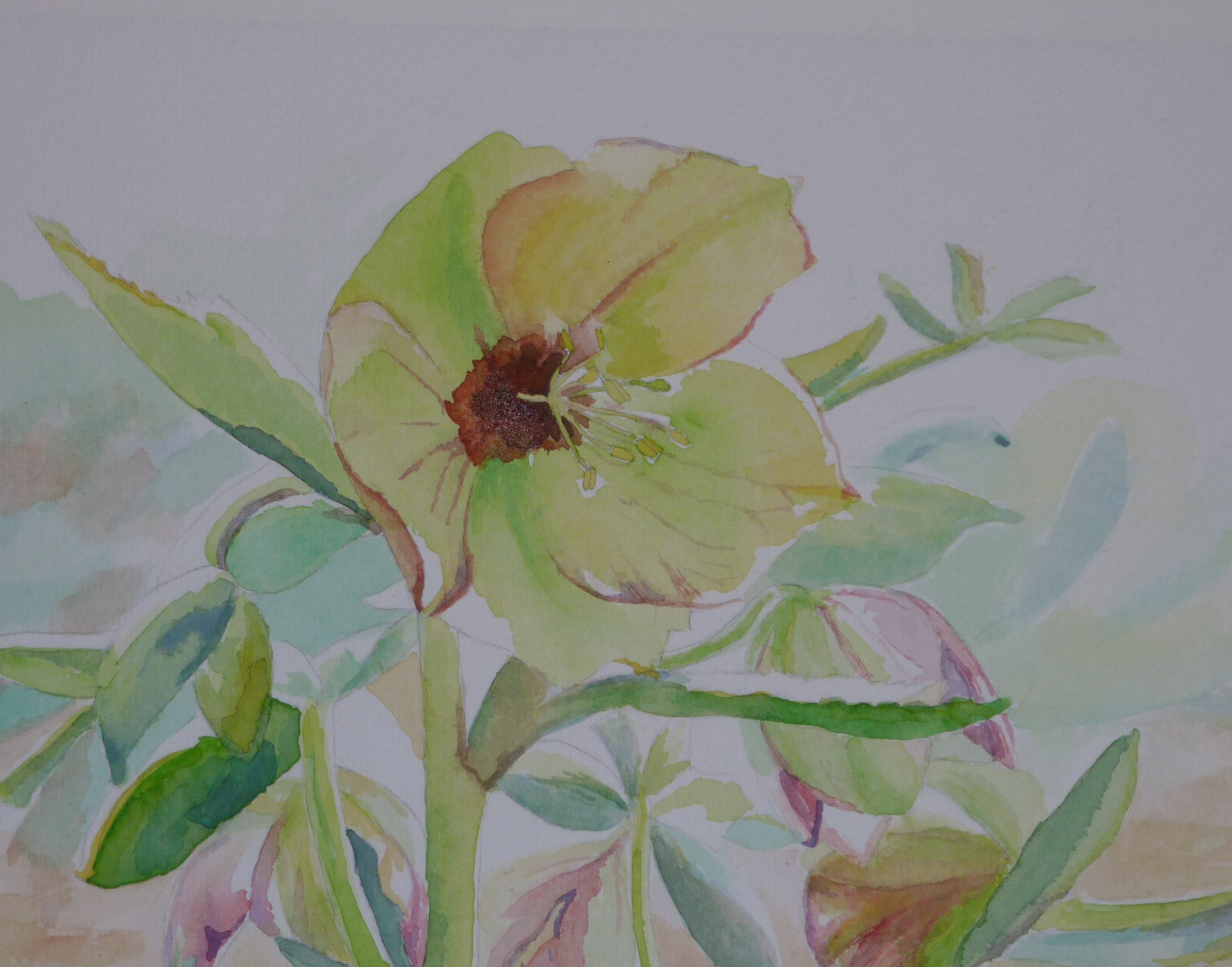 Geel Blauw Groen Aquarel Bloem Passepartout Bloei Ingelijst Creme Helleborus Rood/paars