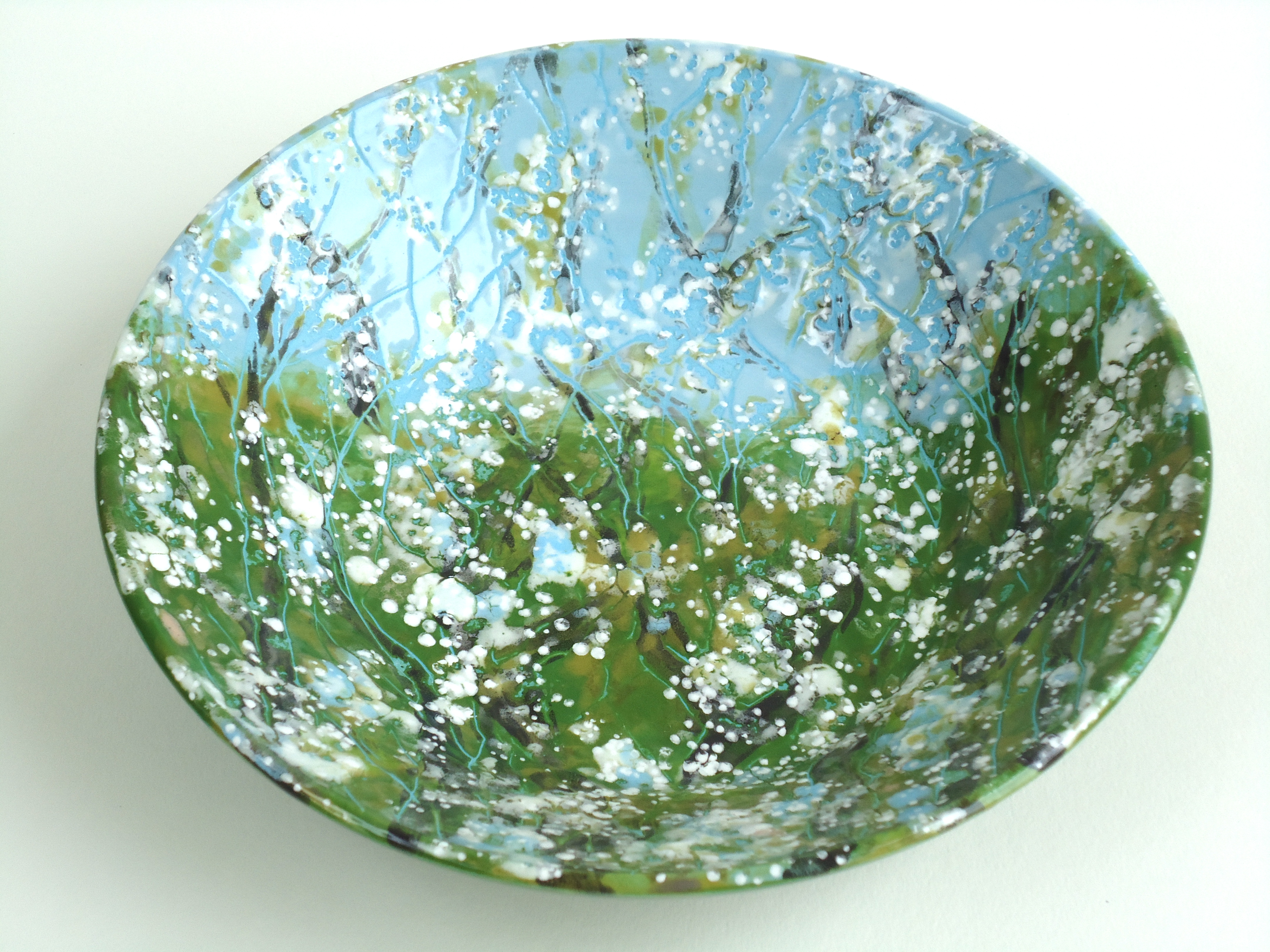 De ronde vorm van mijn keramiekschalen - die ik zelf draai - schept een ideale ruimte om bloemen, bomen en landschappen te verbeelden en in te sluiten. Zo kan ik tekenen, schilderen en ruimtelijk vormen met elkaar combineren.