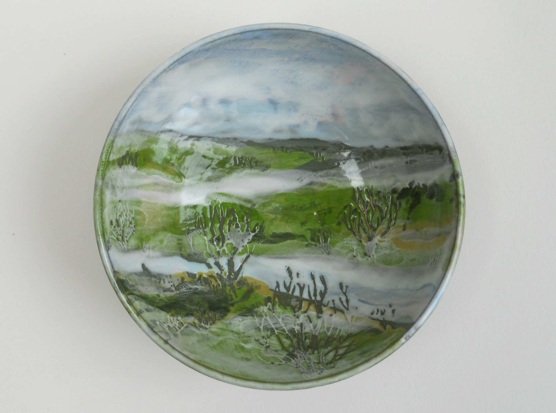 De ronde vorm van mijn keramiekschalen - die ik zelf draai - schept een ideale ruimte om bloemen, bomen en landschappen te verbeelden en in te sluiten. Zo kan ik tekenen, schilderen en ruimtelijk vormen met elkaar combineren.