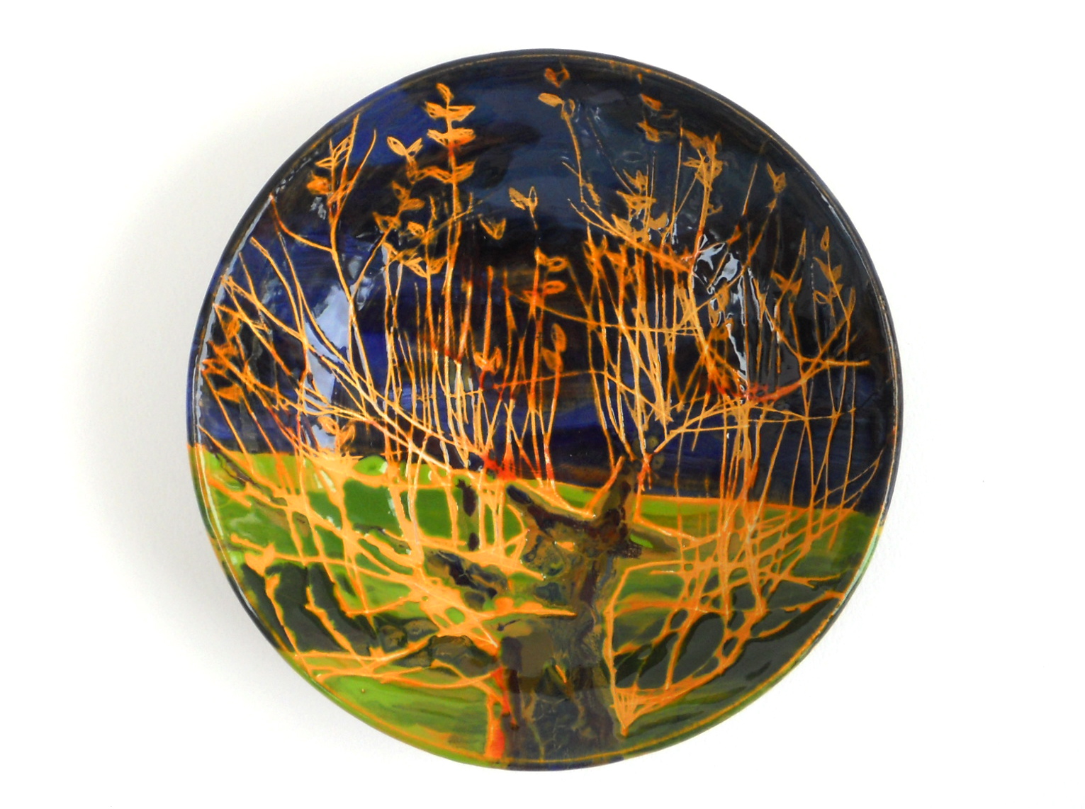 De ronde vorm van mijn keramiekschalen - die ik zelf draai - schept een ideale ruimte om bloemen, bomen en landschappen te verbeelden en in te sluiten. Zo kan ik tekenen, schilderen en ruimtelijk vormen met elkaar combineren.