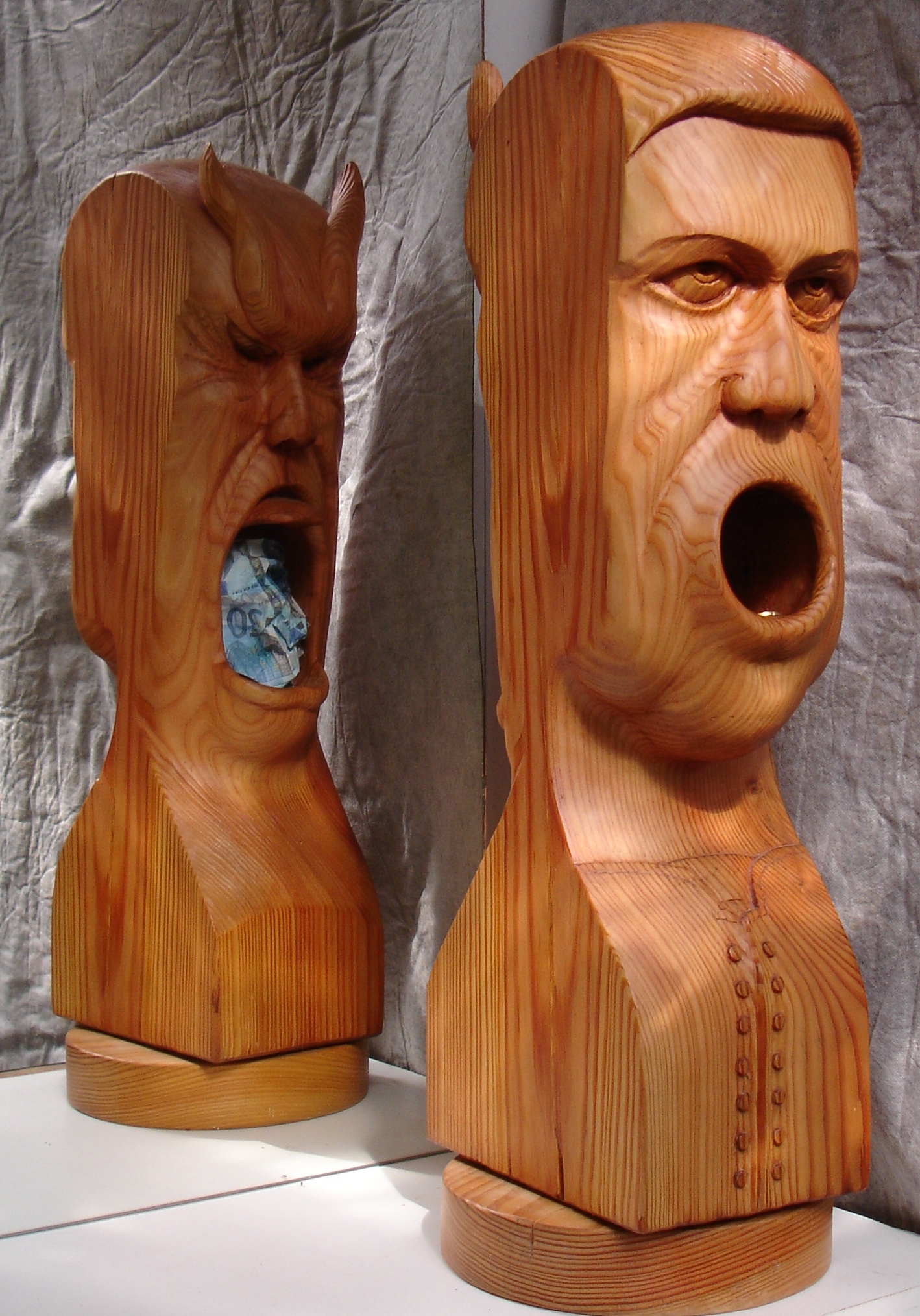 Houten beelden van Djef Blok, surrealistische en vol ironie, soms mild, soms bitter of lieftallig, maar altijd betekenisvol.