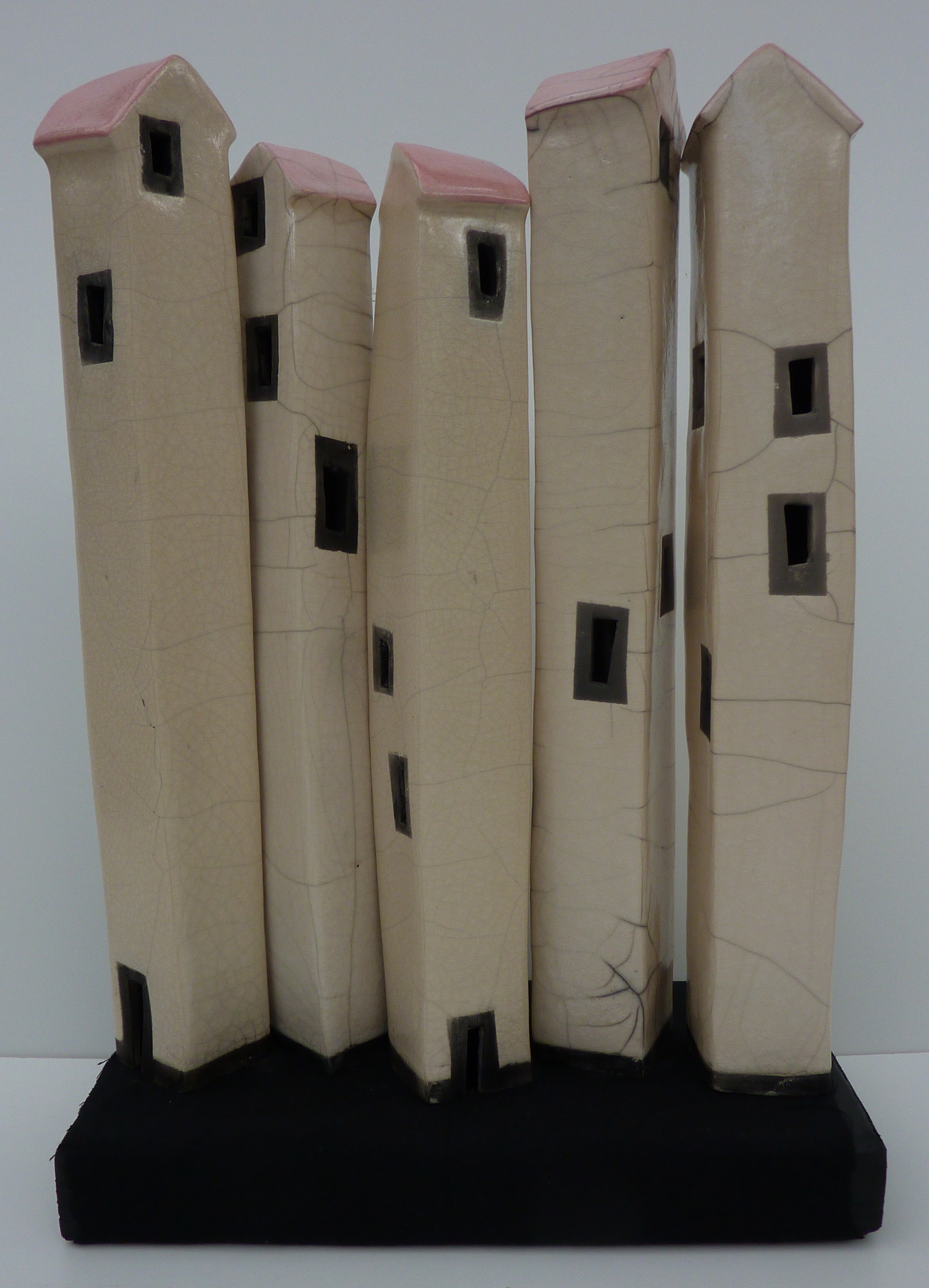 Vijf hoge huisjes in een rijtje. Raku gebakken.