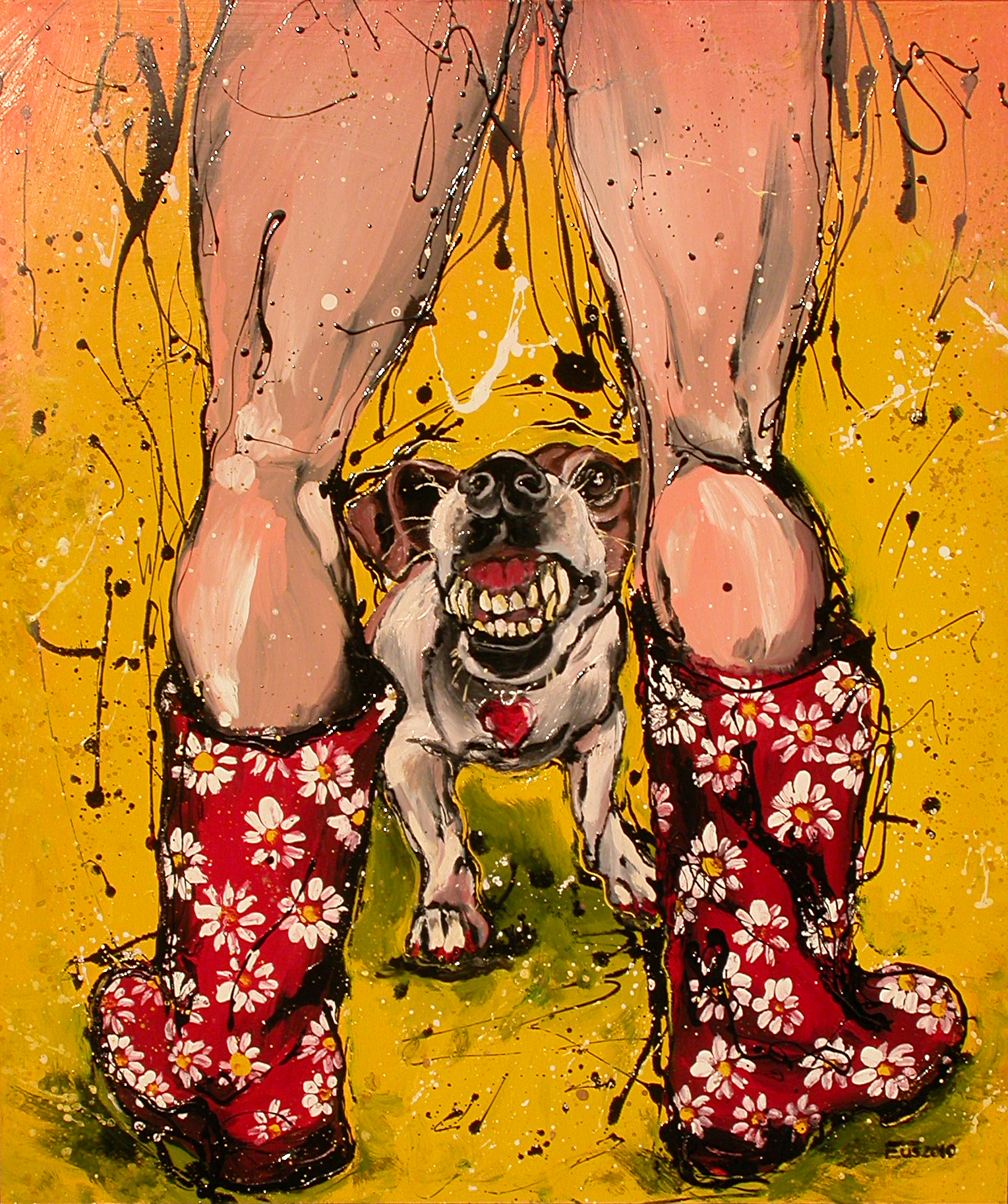 Geel Yellow Rode Dieren Red Sureeel Hond Legs Benen Laarzen Dog Animals Wraak Humor Boots Erlinde Ufkes Stephanus Animalart Dierenkunst Hondenkunst Dierenschilderijen Animalpaintings Revenge Hondenschilderijen