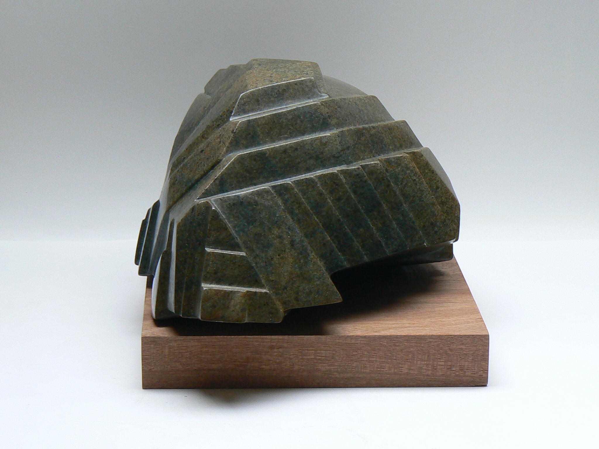 Een beeld van serpentijn (bruin-zwart). Trappen, richels, vlakken en terrassen vormen een landschap. De onderstaande maten zijn zonder de sokkel.