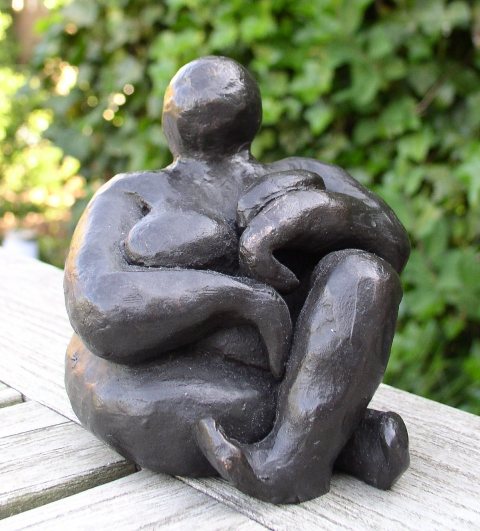 dikke dame op een hoge sokkel. Sokkel is van Belgisvh hardsteen en 100 cm hoog.