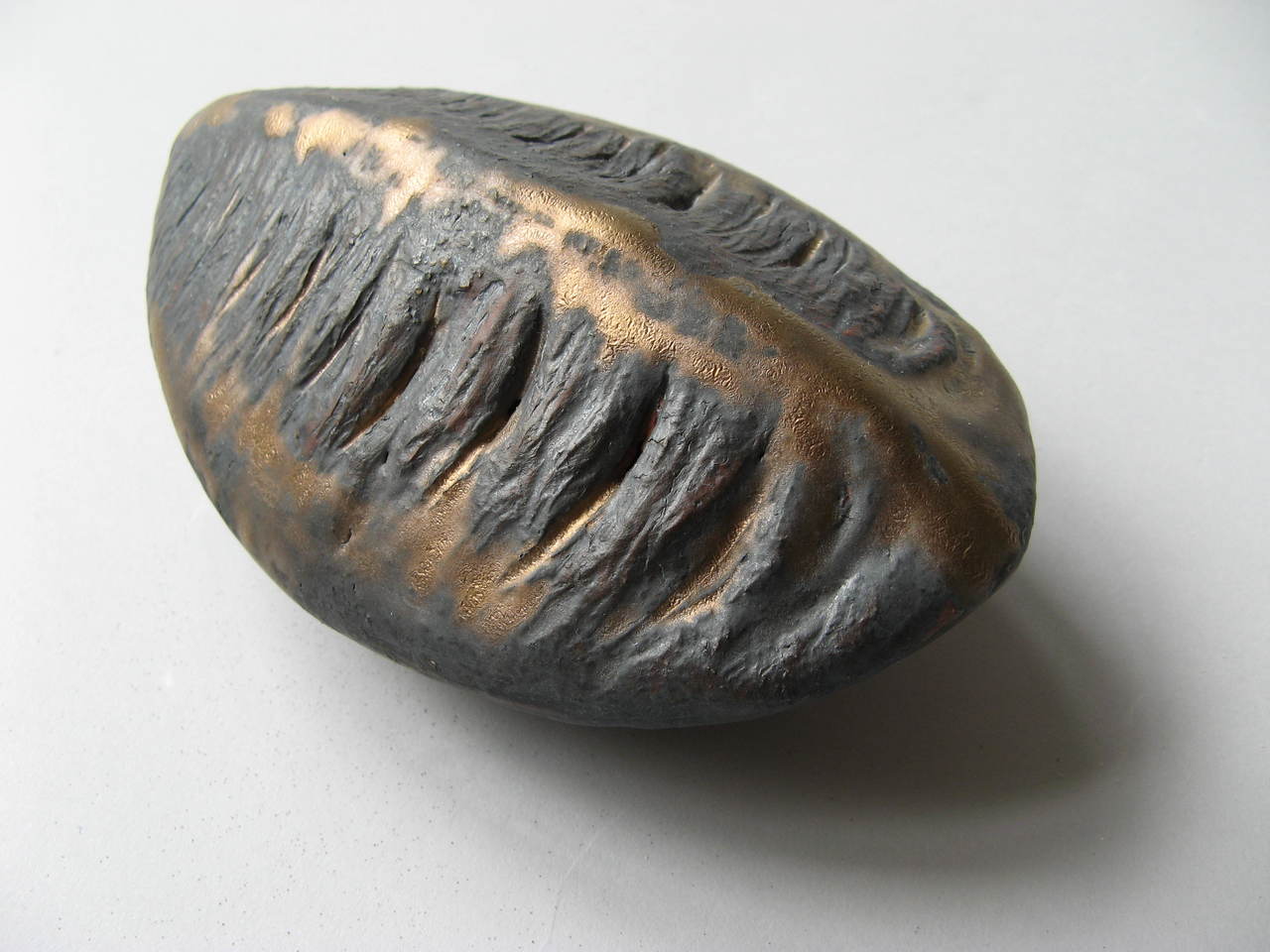Geabstraheerde vorm van een ribbelschild. Een beetje als van een pissebed of trilobiet. Steengoed, glazuur.