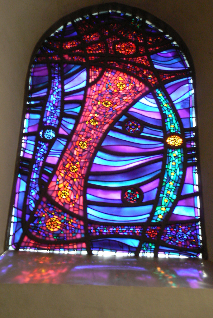Glas in lood raam, let op de reflectie. Sankt Petri-Pauli Kirche, Soest, Sauerland, Duitsland. Eerste elementen opgetrokken meer dan 1000 jaar gelden. Zwaar beschadigd geweest door bombardement eind van 1944.