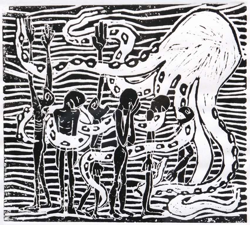 Linoleumsnede, zwarte drukinkt op papier