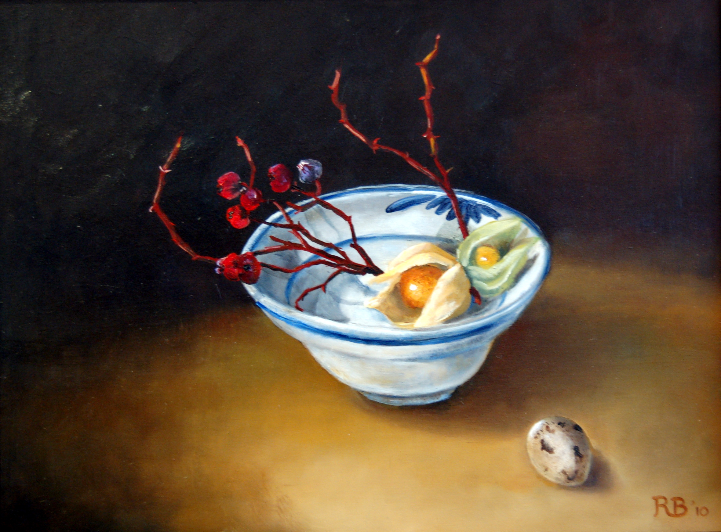 Stilleven: antiek bakje met takje bessen, ingelijst in mooie bruin/gouden lijst