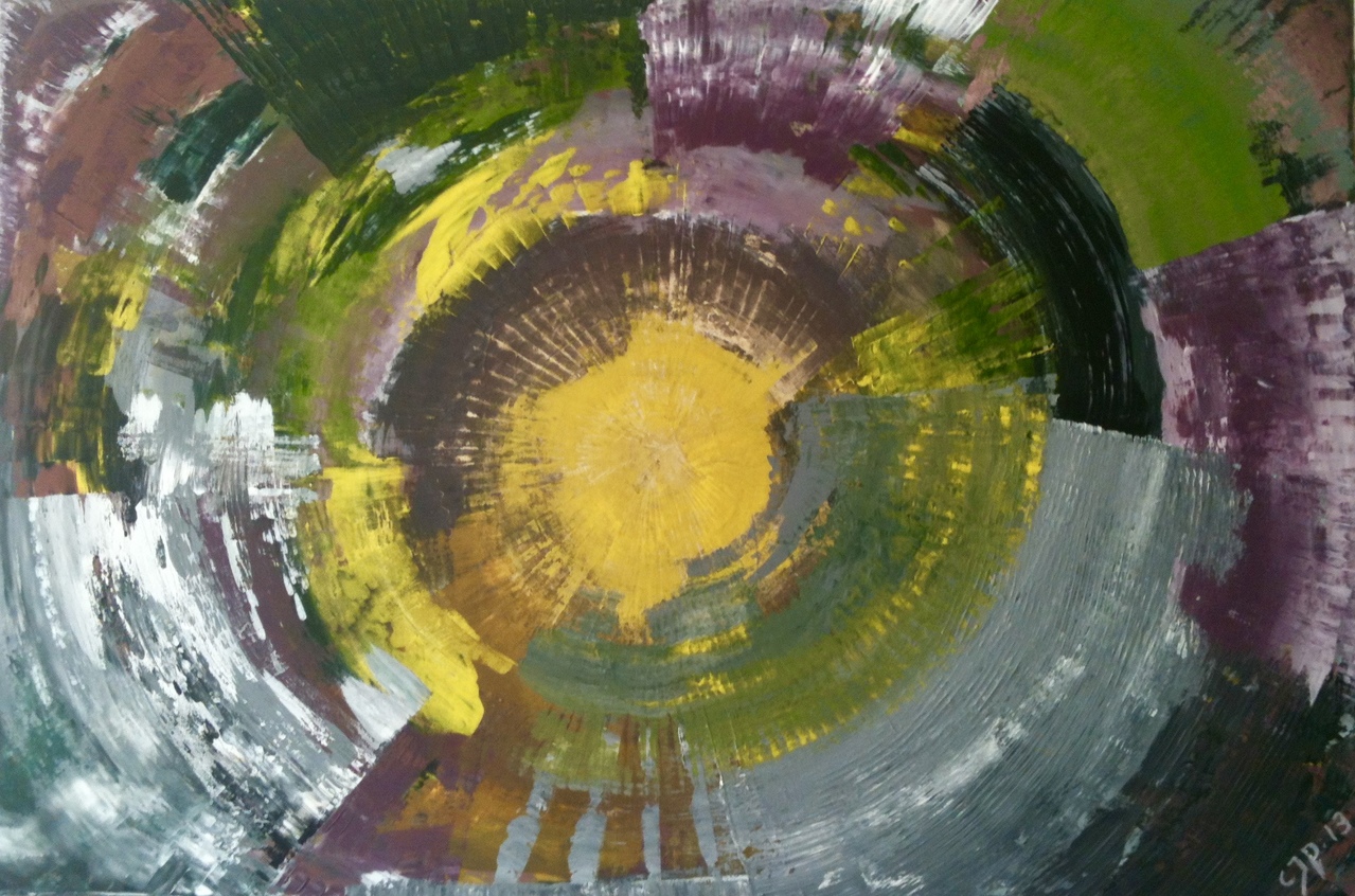 Doordat ik diverse grijstinten en o.a. de kleur geel en groen in een draaiende beweging had gemengd, kwamen de kleuren tot een soort van landschap dat op onze aarde lijkt vanuit de lucht! Abstract expressionisme Acrylverf op een canvasdoek dat gespannen is over een houten frame. Het doek is inclusief een houten lijst en de randen zijn meegeschilderd.