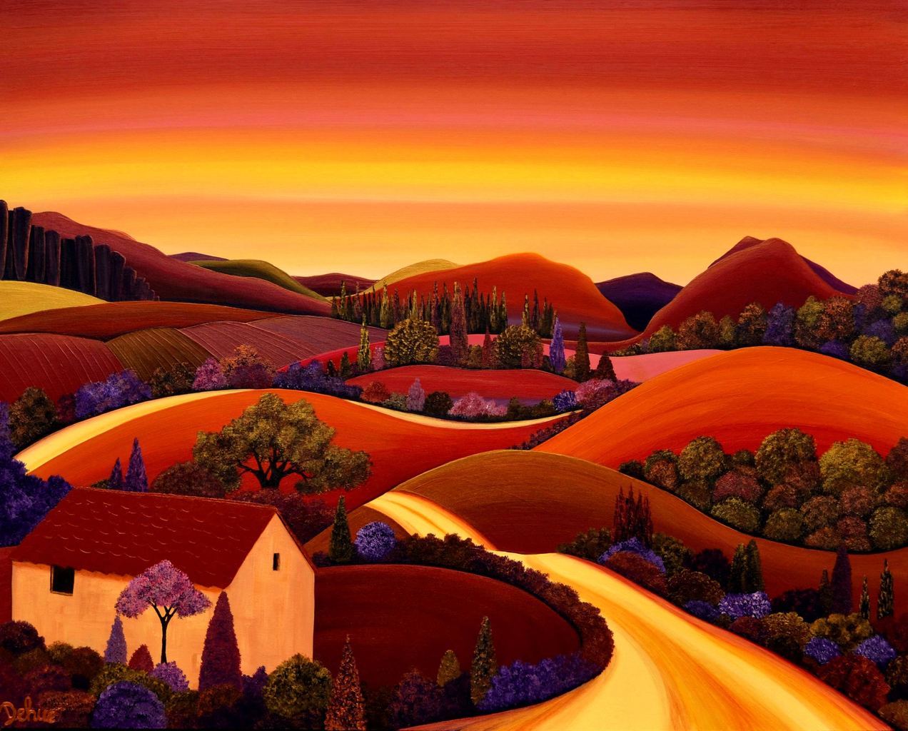 Huis Rood Oranje Geel Landschap Paars Goud Bruin Koper Kleurrijk Bergen Bomen Roze Landscape Warm Droom Uitzicht Sfeervol Heuvels Colorful Gloed View Dream Droomlandschap Dreamscape