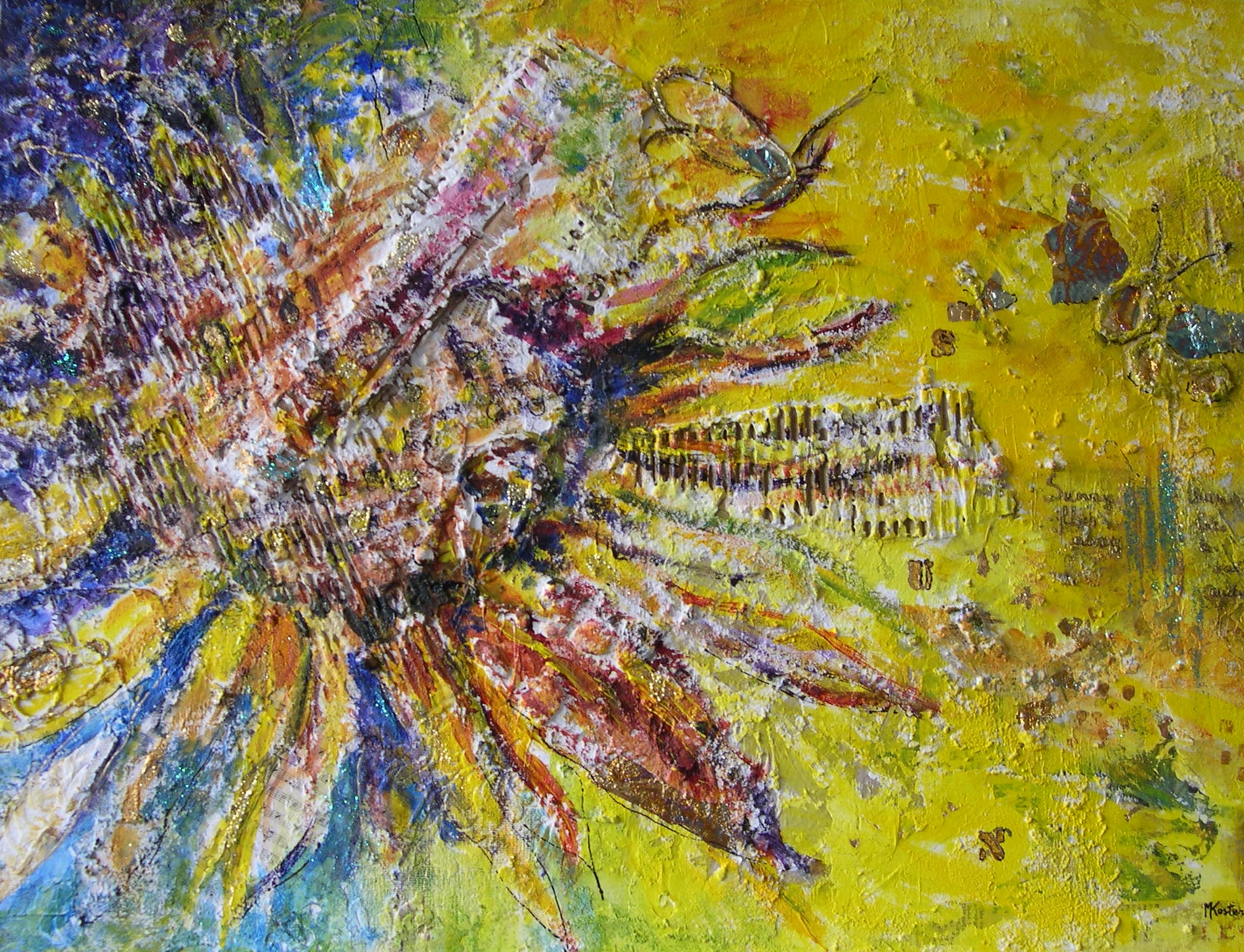 Collage van stukjes golfkarton, draad, gesso+zand, muziekpapier, bladgoud, bladkoper en glasschilfers op doek. Acrylverf met zijkanten meegeschilderd. In blankhouten baklijst. Gevernist. "Sunny summer flies away into a warm autumn" (stap voor stap te zien: www.mariankoster.webs.com)