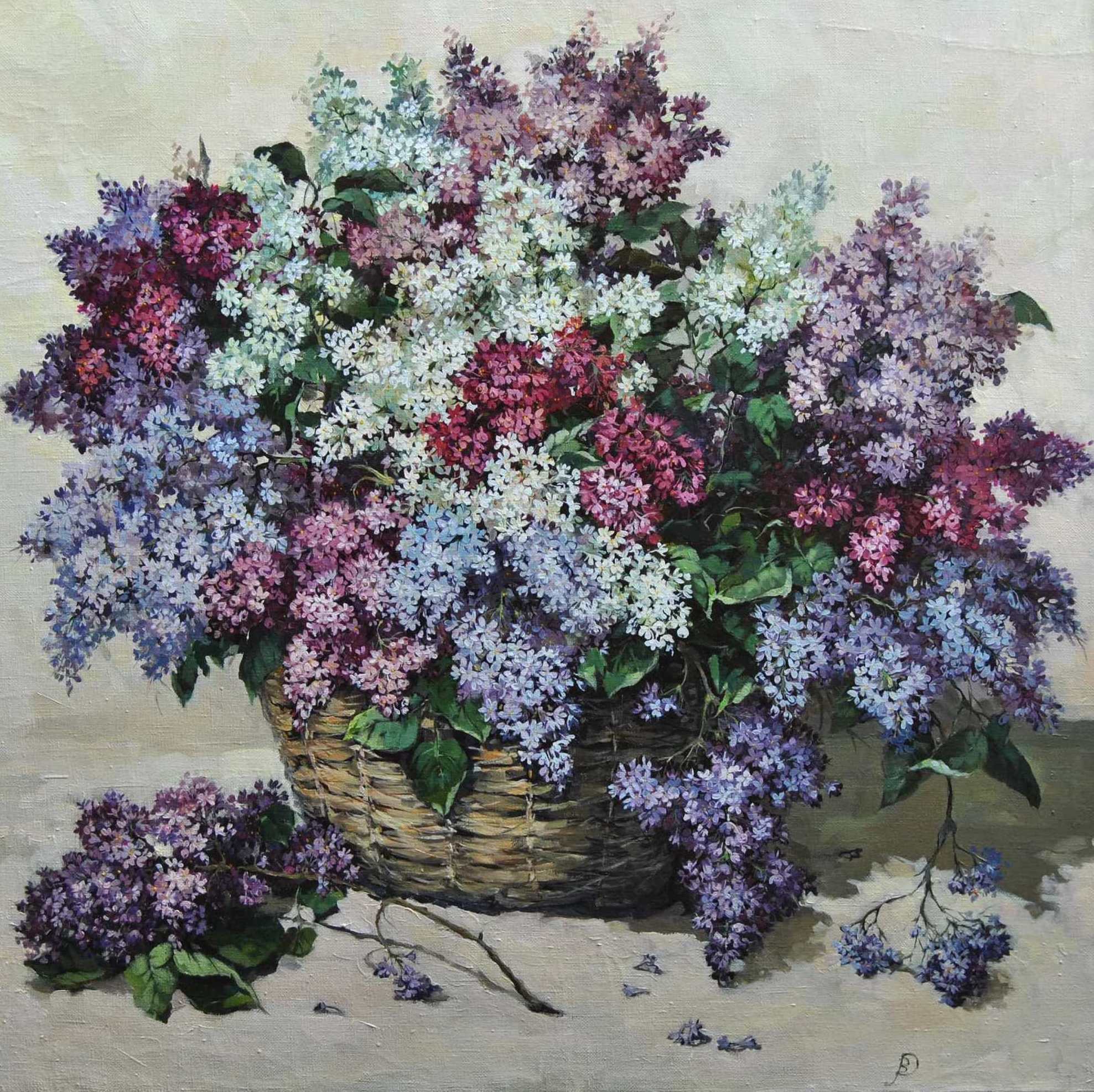 Wit Grijs Blauw Paars Groen Realistisch Olieverf Doek Bloem Stilleven Roze Sering