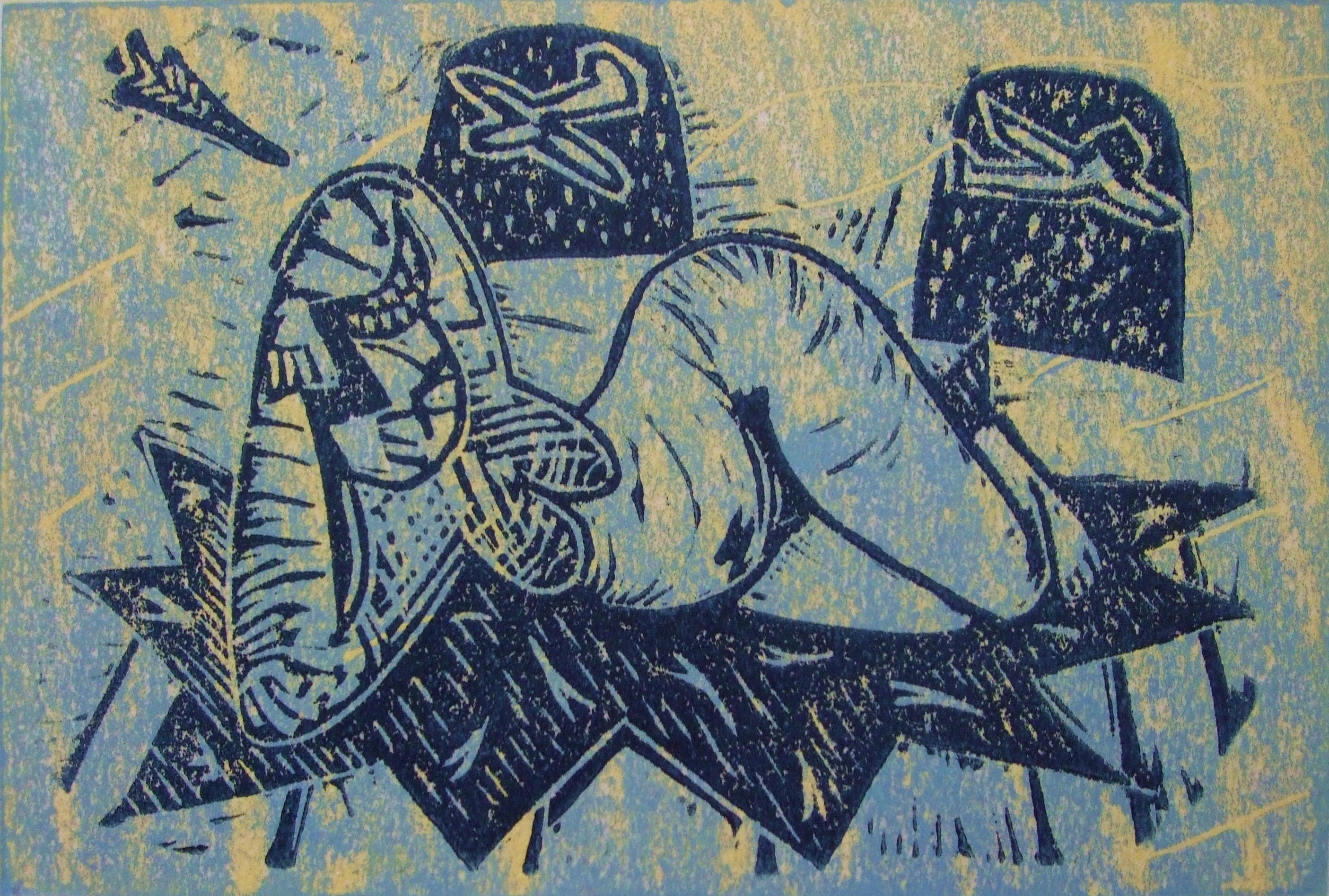 Meerkleuren linosnede, achtergrond kan iets afwijken per exemplaar. Met de hand gedrukt op etspapier (papierformaat iets kleiner dan A4, Beeldformaat:11x16 cm).
