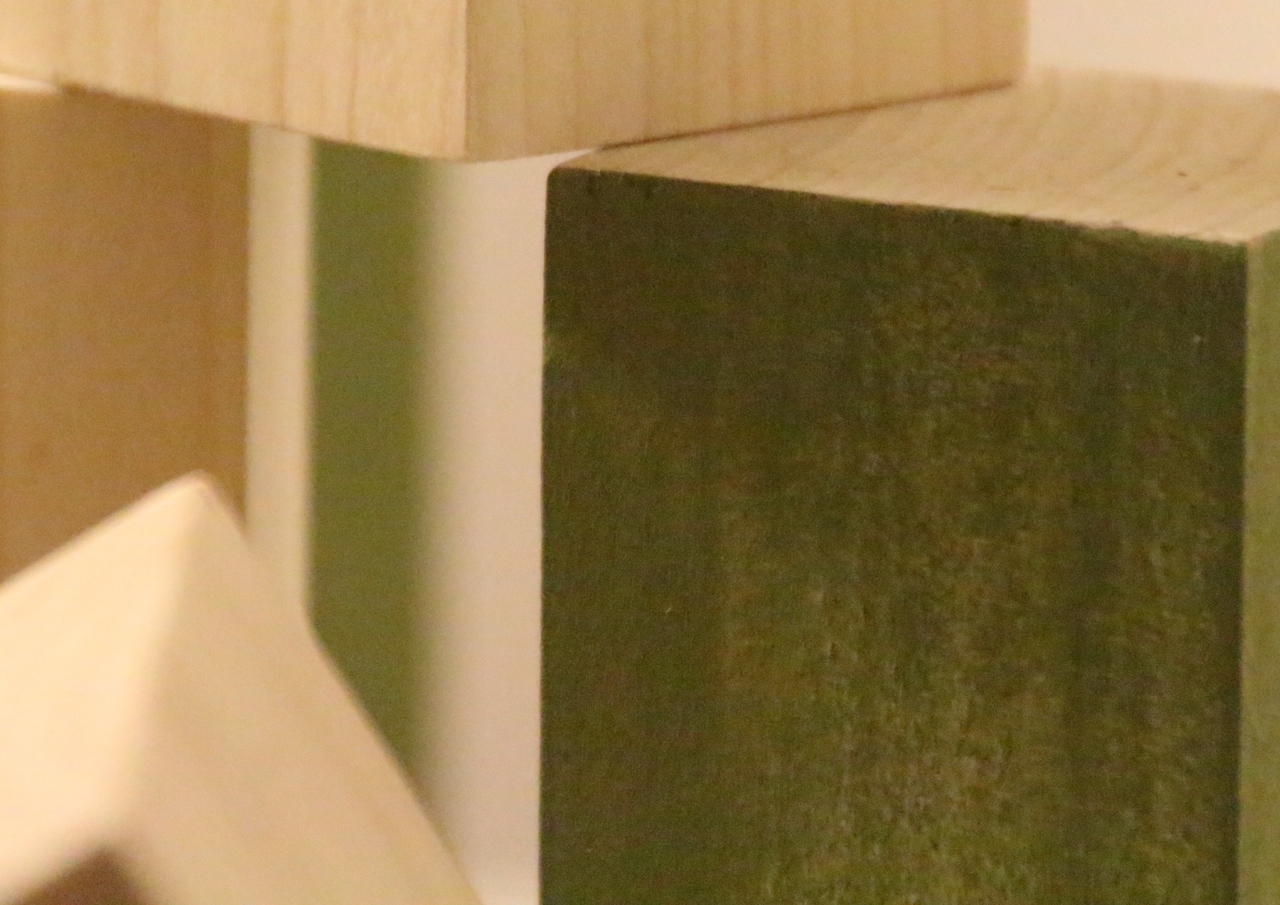 Close-up beeld van houten blokken als onderdeel van een installatie. Op foamboard (diep 0,5 cm). Oplage van 6.