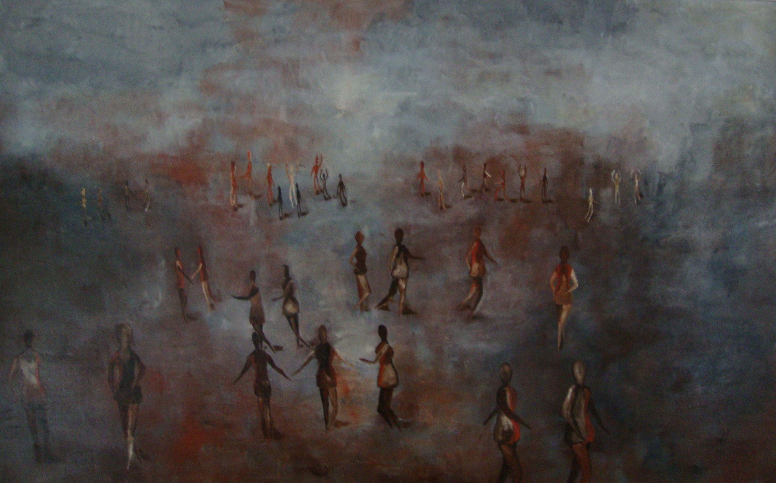 Meerdere personen in een ruimte. Dansen ze of lopen ze weg? Wie zal het zeggen.