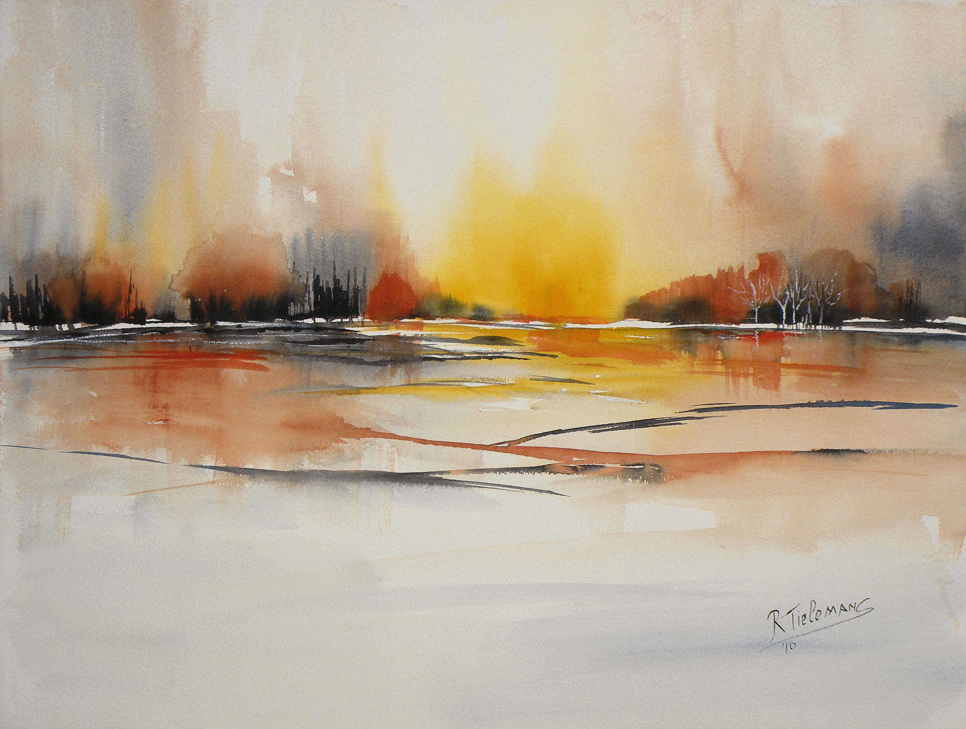 Rood Geel Zwart Landschap Yellow Aquarel Red Black Landscape Schemering Watercolour Twilight