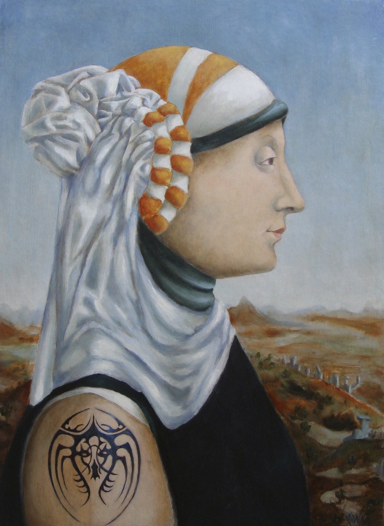 Naar della Fransesca. Battista Sforza werd samen met haar man Frederico de Montefeltro geschilderd door della Fransesca. Deze werken behoren tot de topstukken in het Uffizi in Florence.
