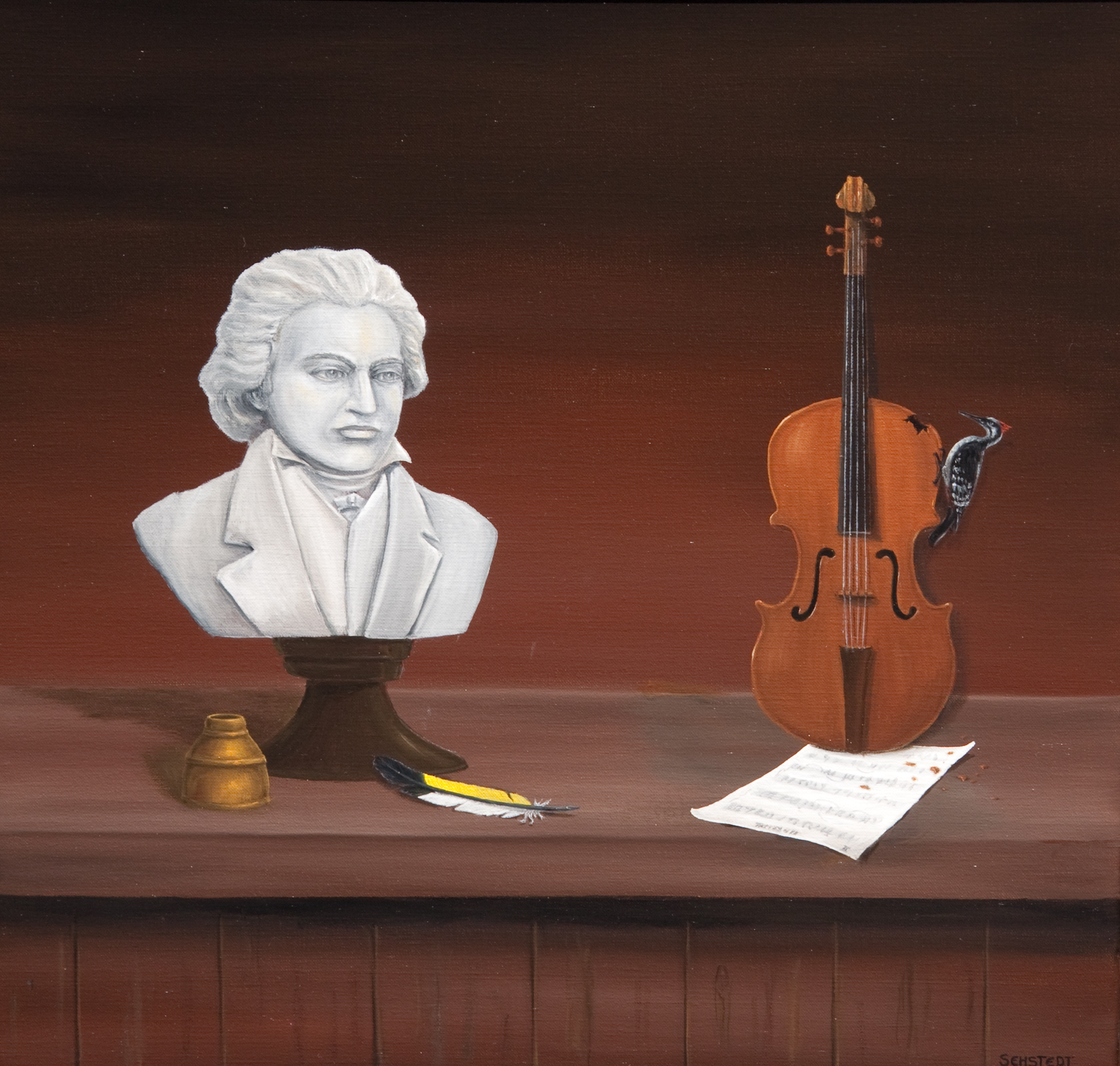 Surreeel Vogel Bruin Stilleven Brown Surrealisme Exto Muziek Specht Beethoven Veer Viool Violin Borstbeeld Bladmuziek Stillife Sehstedt Sureel Inktpot Jachthaven Otto Uiterweg Aalsmeer Ophelialaan