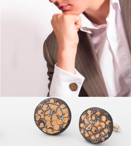 Zwartbakkende steengoedklei, met porseleinslib, 18 karaat goudspikkels, verzilverde setting.