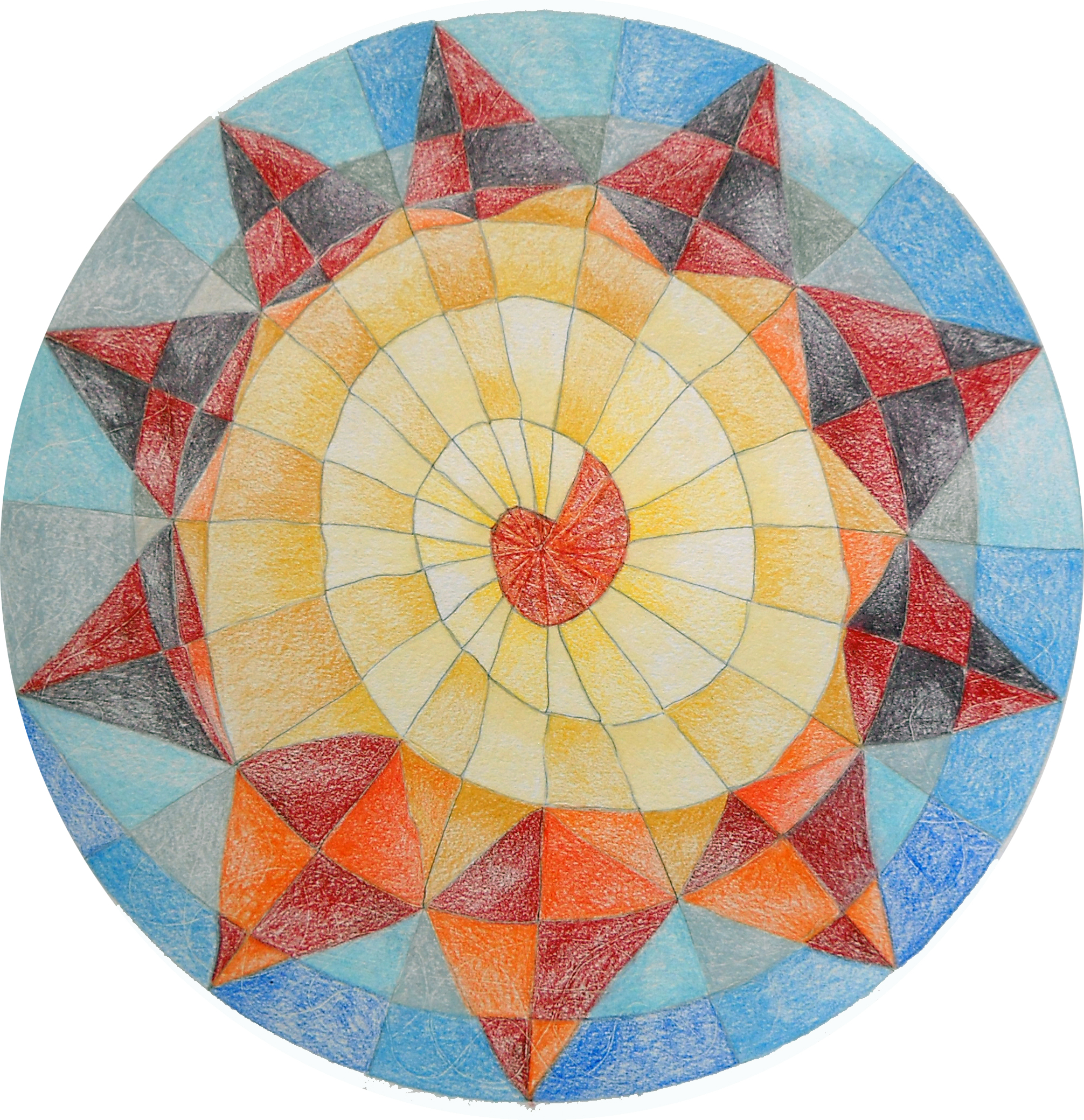 Alleen de cirkel is met een passer gemaakt. De invulling uit de losse pols zoals het in mij opkwam. Ik houd van grafische figuren