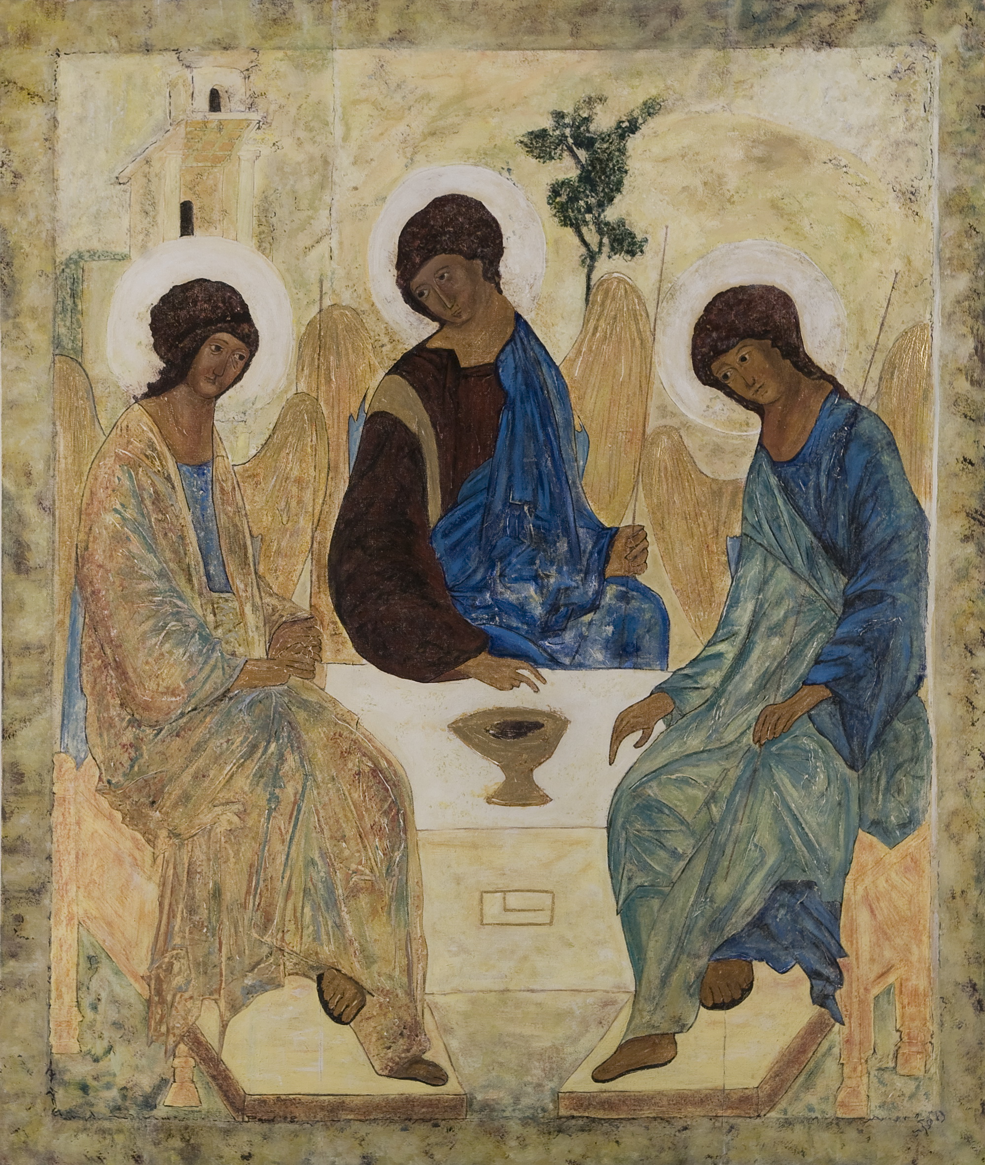 Moderne versie van een bestaand 15e eeuws Russisch Ikoon met nadruk op de beschadiging en slijtage door de eeuwen opgelopen.