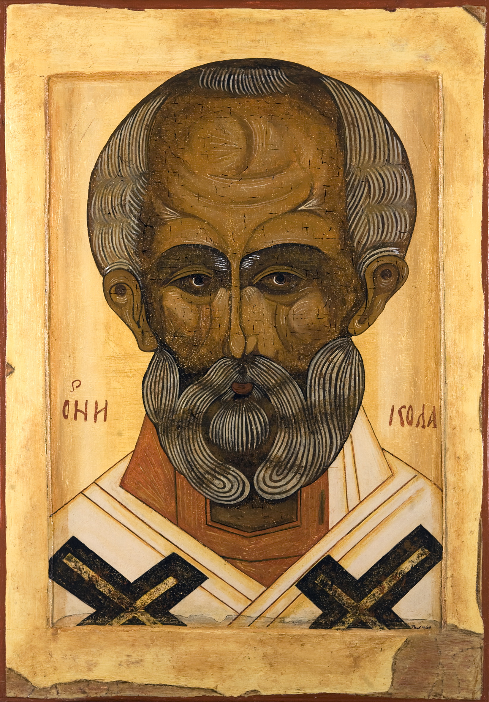 Moderne versie van een bestaand 17e eeuws Russisch Ikoon met nadruk op de slijtage en beschadiging door de eeuwen opgelopen.