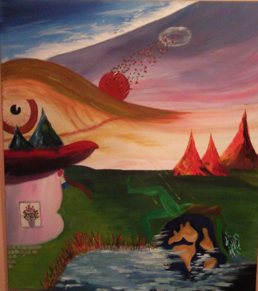 Een droom: wonen in een rose paddenstoel, de aarde omarmen, vreemde puntbergen en rozen van geluk vinden hun weg van de rode planeet naar een wolk.