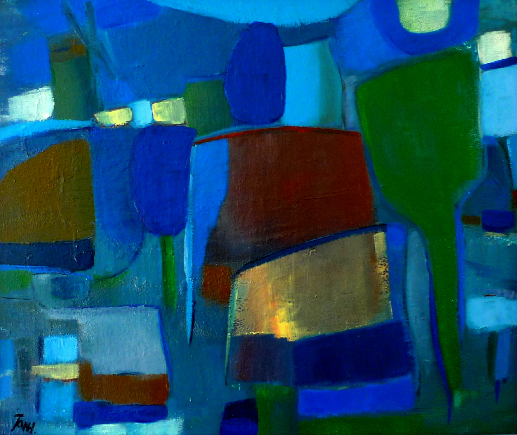 De Blauwe Polder is niet echt blauw als je er goed naar kijkt. Blauw is de grondtoon waar allerlei andere kleuren min of meer doorheen komen. Daardoor lijkt het alsof het om het schemerduister gaat, om een geheimzinnige sfeer. Voeg daarbij ook nog de (niet afgebeelde) blauwe lijst en je hebt een fraai geheel.