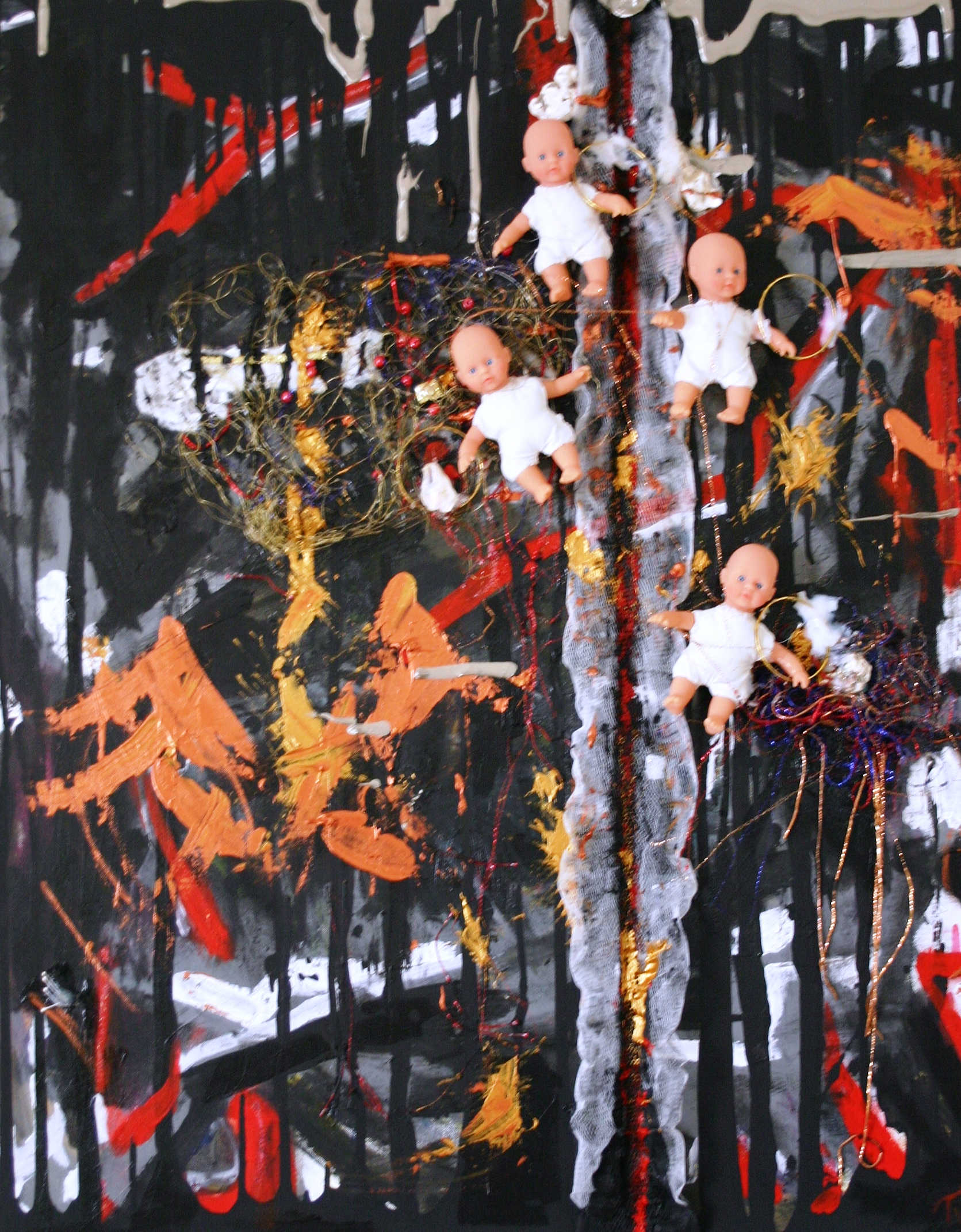 Rood Zwart Goud Vier Nylon Zilver Ringen Draad Pop Poppen Chaos Poppetjes Materieschilderij Baby's Popjes