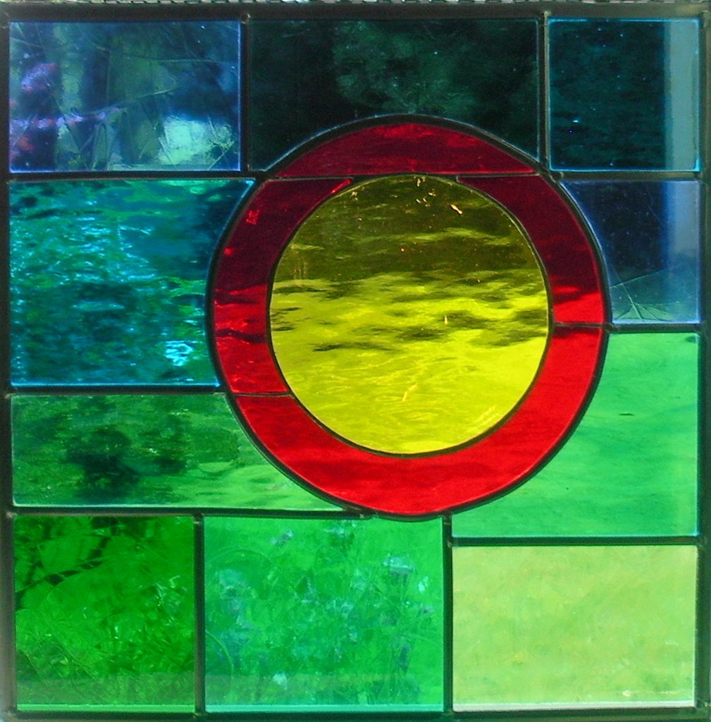 Glas in lood raamhanger " Zon". Eigen ontwerp. De zon is in tiffany gemaakt, de rest in lood.