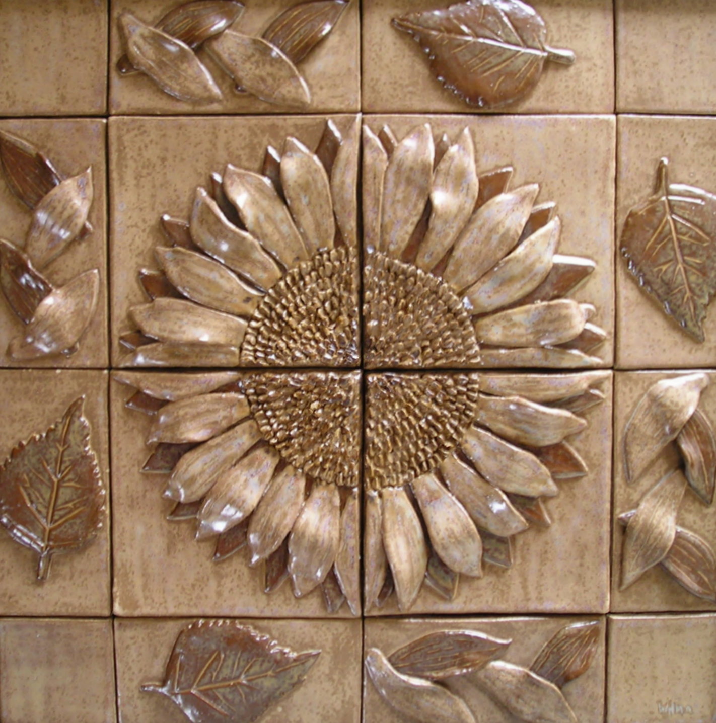 hand gevormde tegels op houten paneel, klei, zonnebloem, reliëf, gestookt op 1220º, bruin nuance zijdeglans