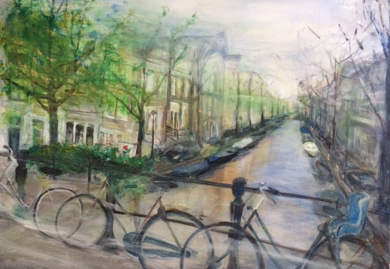 Ik ben op de Egelantiersgracht. De brug is versierd met fietsen en het is een mooie dag om door de stad te wandelen.