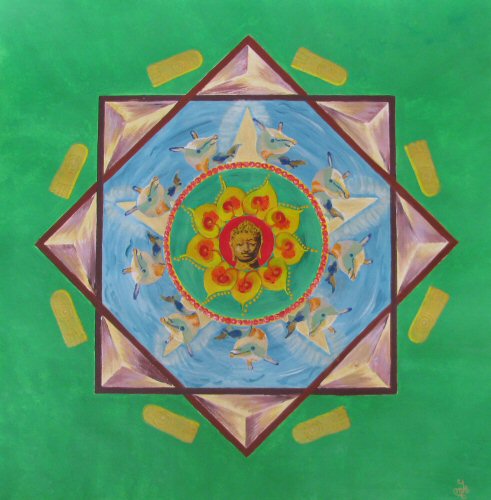Deze mandala is in opdracht vervaardigd voor een client en grotendeels opgezet op basis van de getallen van de geboortedatum en het lotsgetal van de persoon. Een en ander voorzien van op de persoon afgestemde kleuren en symboliek.