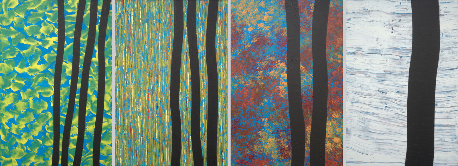 De 4 jaargetijden zoals te zien in de natuur, gereduceerd tot wat voor mij de essentie is Opgeplakt op hout en ingelijst in verdiepte zwarte baklijsten 4 luik