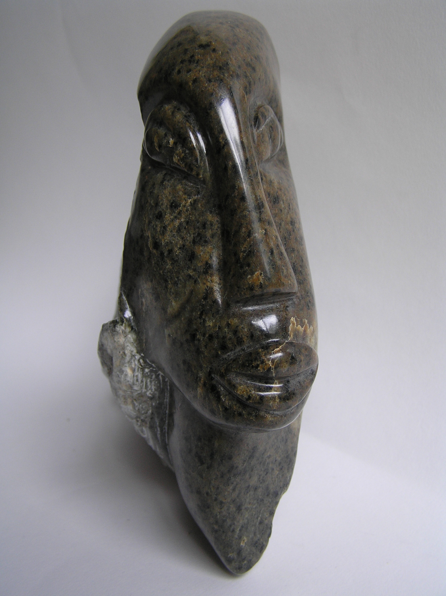 Beeld gemaakt van speksteen. Aan beide zijdes van de steen staan 2 gezichten. Het tussenstuk is ruw gelaten. Zie ook de andere foto (zonder titel 1) voor het vooraanzicht.