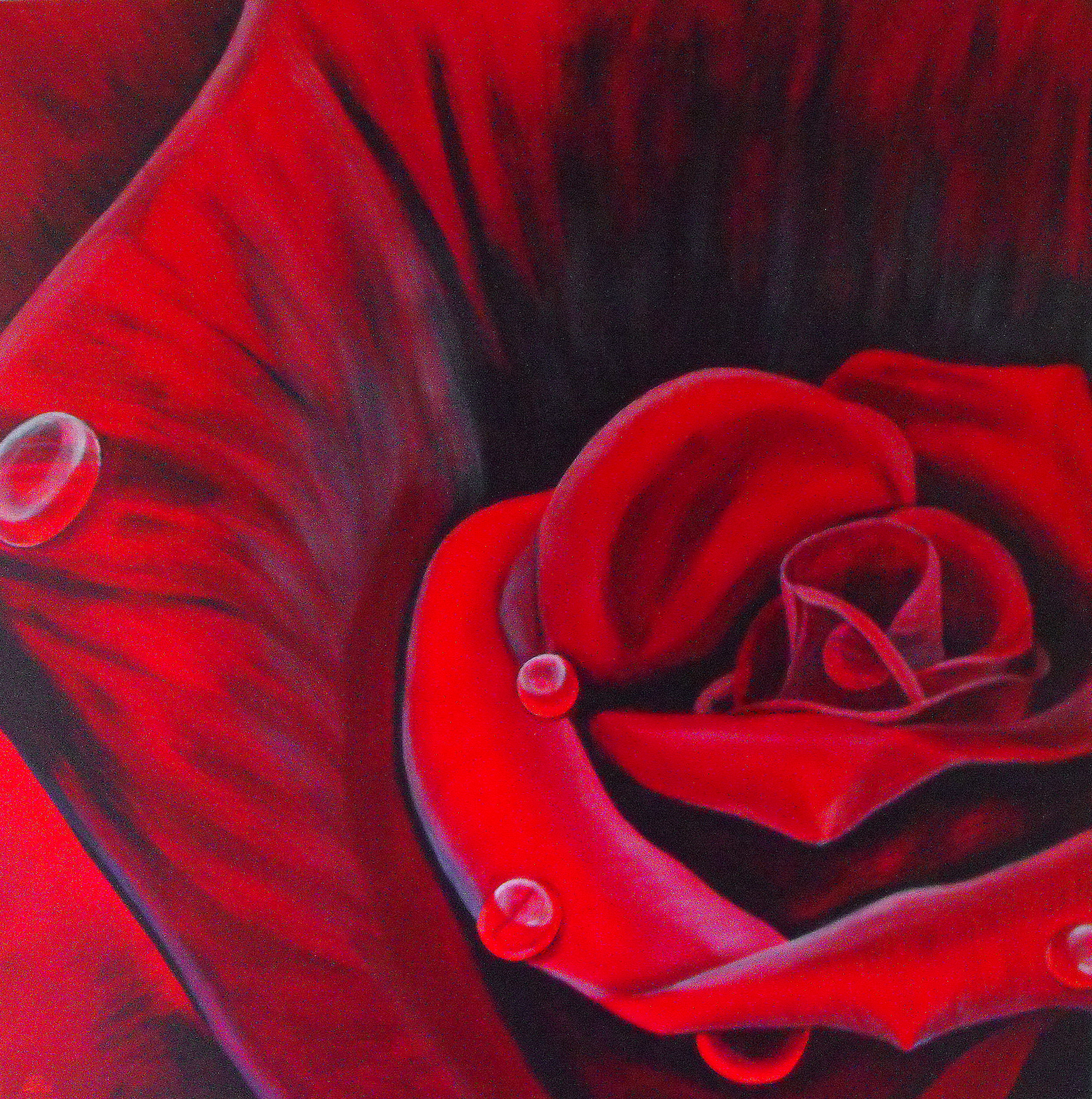Rood Acryl Rose Rode Bloemen Liefde Rozen Realistisch Bloem Red Love Flower Flowers Roses Roos Linnen Realistic Linen Waterdruppels Velvet Fluweel Rozenschilderij Regenwater Water-drops Rose-painting