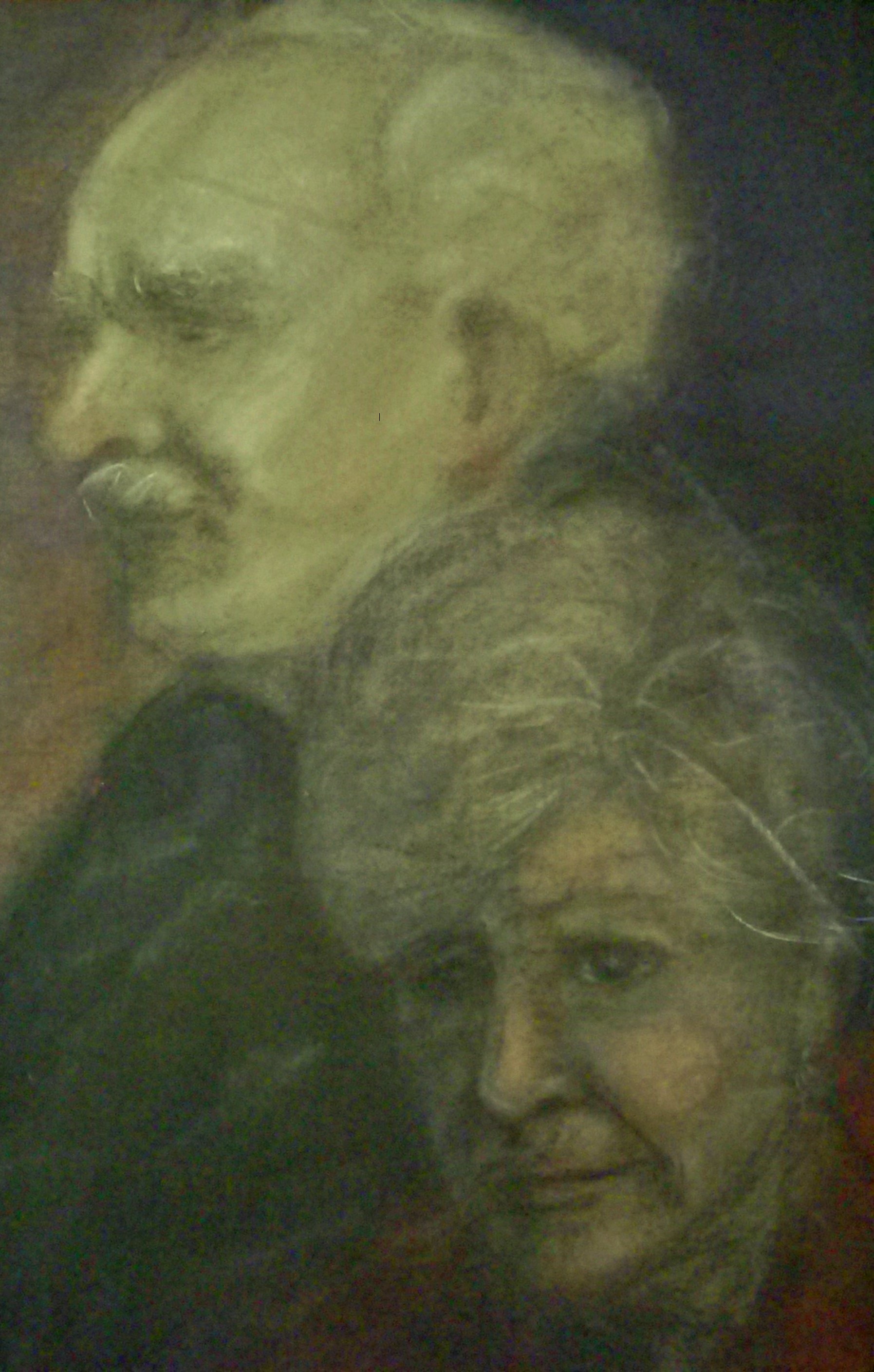 Ouder echtpaar getekend met contékrijt op lichtbruin papier.